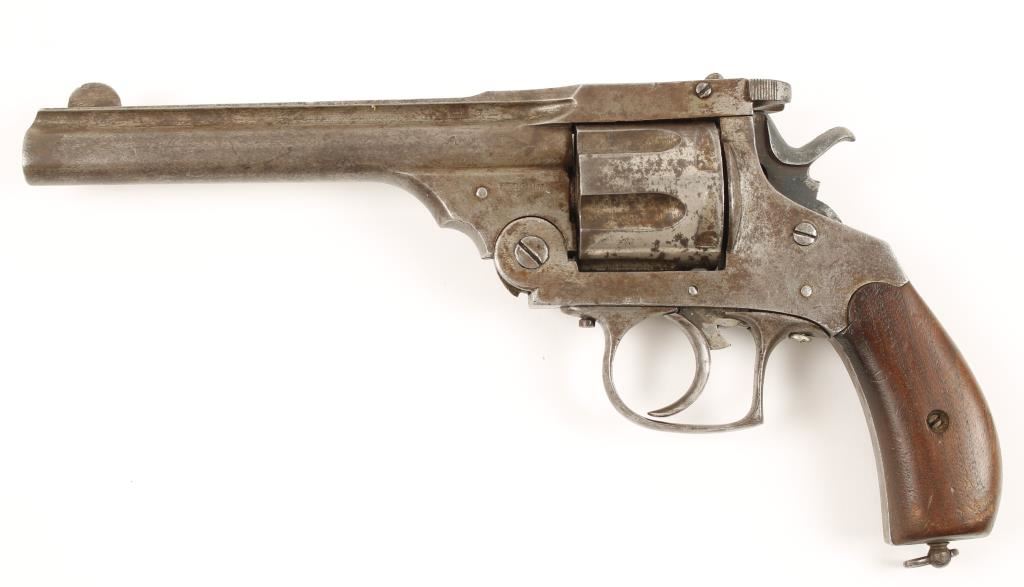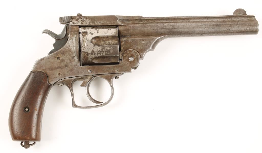 Formerly nickel plated copy of a Smith & Wesson Double Action 6-shot top-break revolver with a 6-1/4" barrel. Almost all of the plating is gone. The finish is now a dirty grey/silver. Replacement screws protrude form the frame in many locations. The bore is bright and shiny and the chambers are clear. Action rotates the cylinder but the hammer doesn't cock in either single or double-action mode. The smooth plain wood grips have some dings and scrapes. Condition is poor. *Modern Firearm*