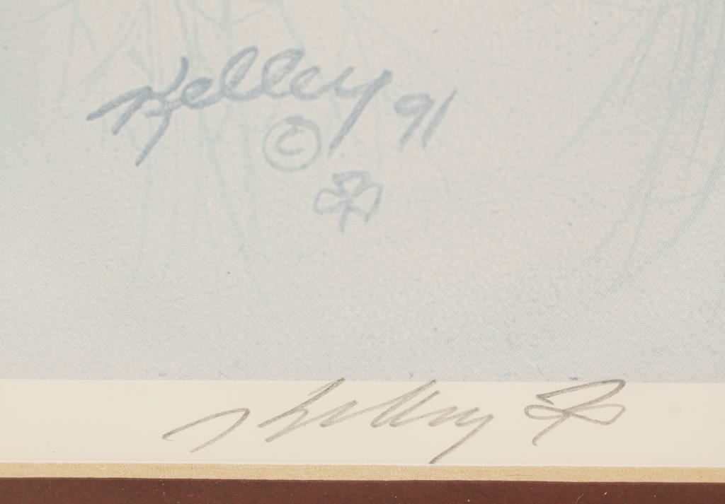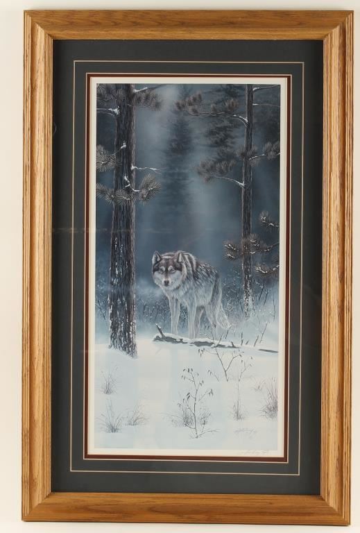 Professionally matted and framed. Rick Kelley is a well known wildlife artist. His wildlife and western art is a visual journal of his life experiences and travels. It is the vision coupled with Kelley's scientifically and historically correct images that have made him one of the most popular and critically acclaimed wildlife artists today. This print depicts a lone grey timber wolf out in the snowy forest. It is double signed and dated '91. It measures 19" x 30".