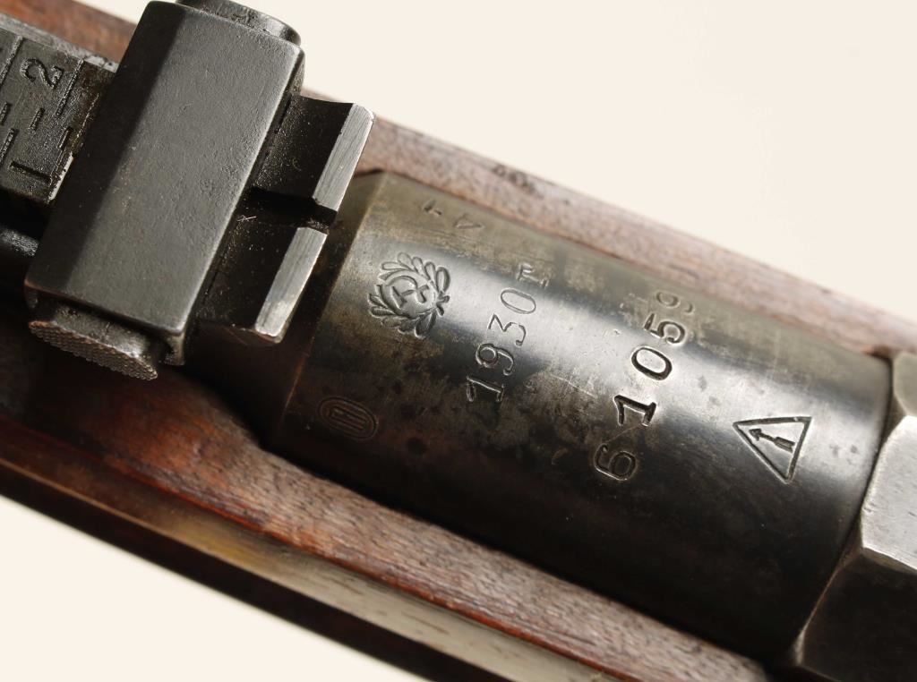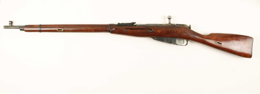 Blued Russian bolt-action rifle with a29" barrel stamped 1930 and marked with the Tula arsenal arrow. Has hex receiver. Bolt, barrel and receiver have matching serial numbers. Import marked. Bluing is worn with edge wear. Wood has a replacement chip at the heel of the butt. It also has dings and scratches in the finish. There are cartouches near the top tang of the butt plate. Stock is a poor fit to the receiver. No cleaning rod. Bore has wear but is shiny with strong rifling. Action is sticky but works well. Condition is good.