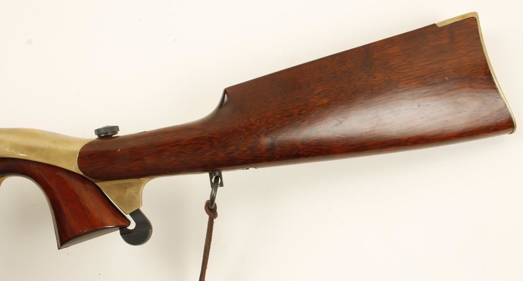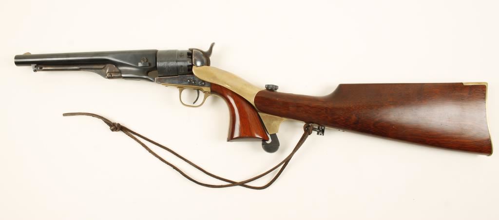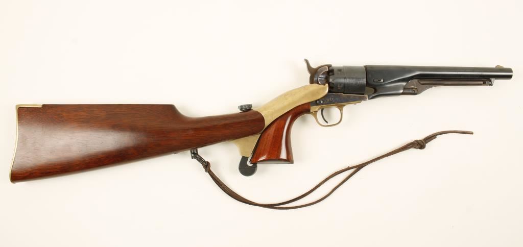 Replica blued and case colored black-powder percussion single-action 6-shot revolver with a 8" barrel and a shoulder stock. Bluing is good with some small specks of surface rust. Cylinder has a roll-stamped naval engagement scene. The case-hardened frame has bright colors and surface rust. The brass front strap has tiny scratches. Wood has a few scratches and dings. Bore is rusty and pitted. Action is frozen. Condition is poor. *Antique Firearm*