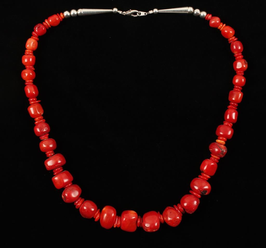 21" long vibrant red necklace with beads that get larger towards the middle of the string. Silver lobster clasp tops of silver end pieces.