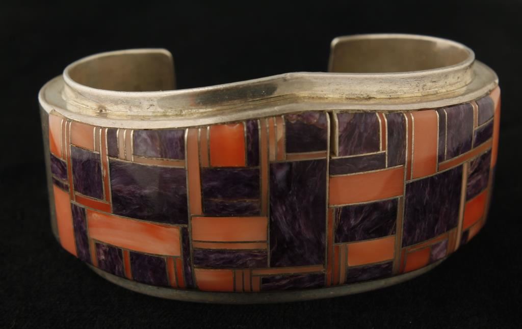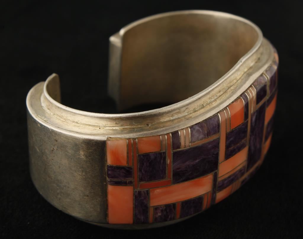 Done in the inlaid Zuni style, set in beautiful sterling silver. Marked on back "TS". In mint condition.