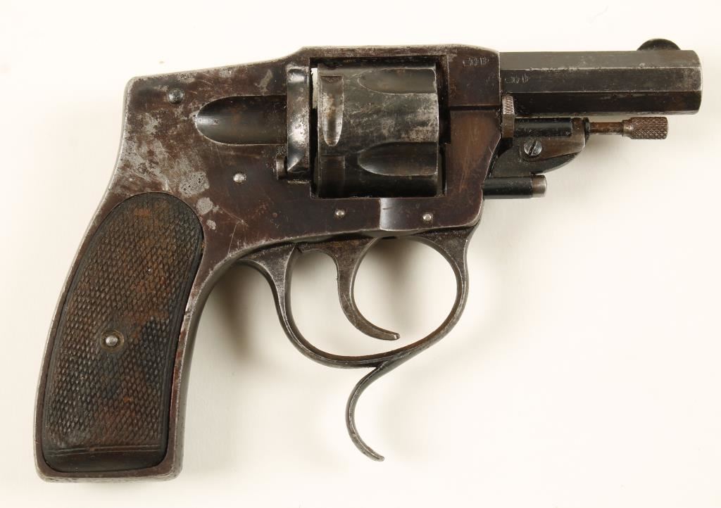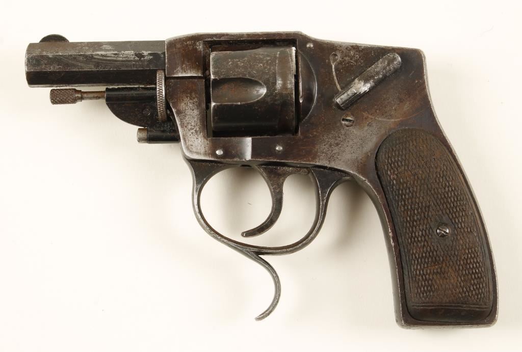 German made blued double-action 5-shot hammerless revolver with a safety and a 2-1/4" barrel. Bluing has wear to edges and exposed areas with surface rust and pitting. Bore is shiny with some small surface rust and sharp rifling. Chambers are shiny. Checkered grips are worn almost smooth in spots. Action is working well with loose lock-up. Condition is fair to good. *Modern Firearm*
