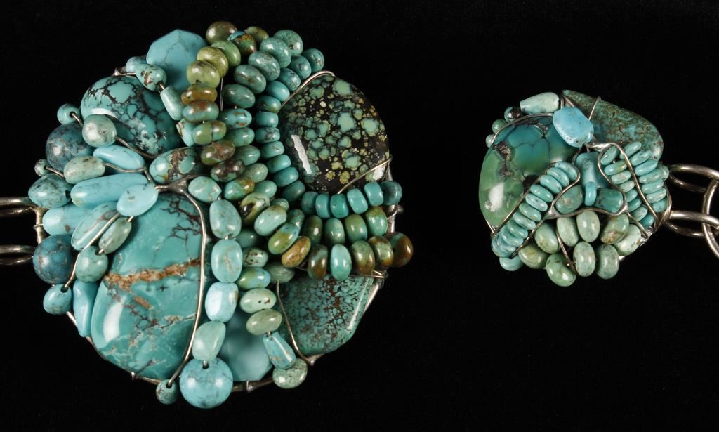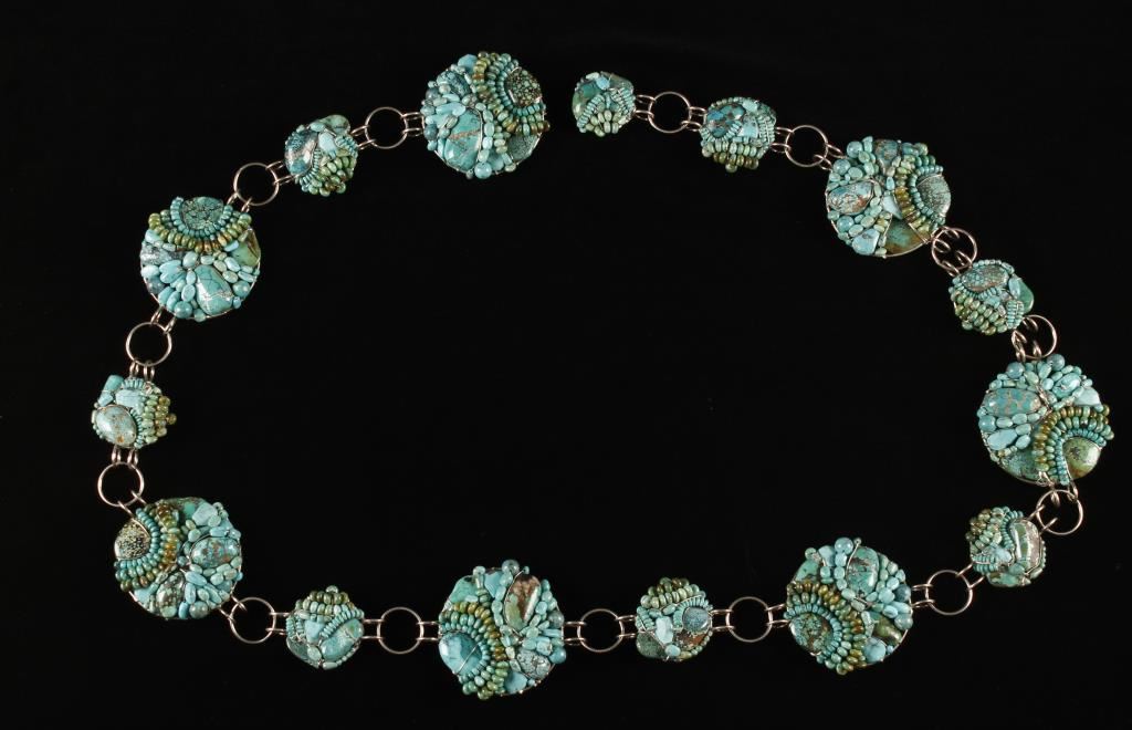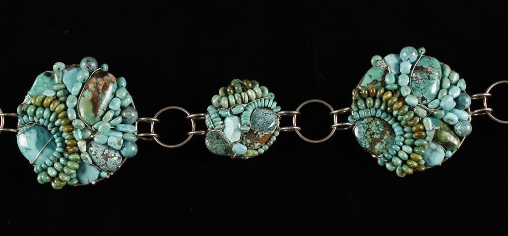 with Wire Wrapped Turquoise, Beautiful design and a one of a kind piece. Measures 49" long, each bigger concho is 3" round and the smaller conchos are 1 1/2" each. 7 large and 8 small conchos.