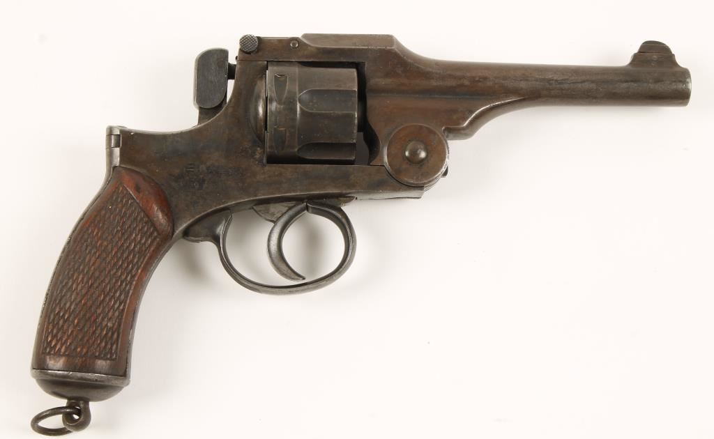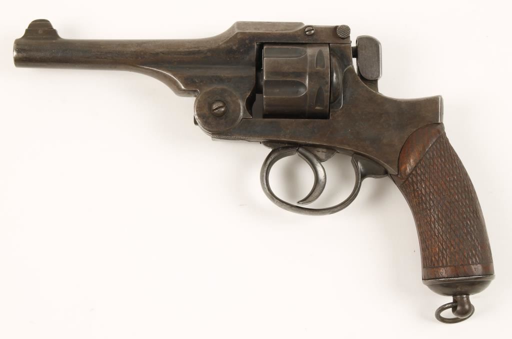 Blued double-action only 6-shot top-break revolver with a 4-3/4" barrel. Finish is faded/worn in exposed areas to a grey/brown patina. Bore is shiny with sharp rifling. Chambers are shiny. Function is very smooth. Checkered wood grips are dark and worn with a few dings. Condition is fair to good. *Modern Firearm*