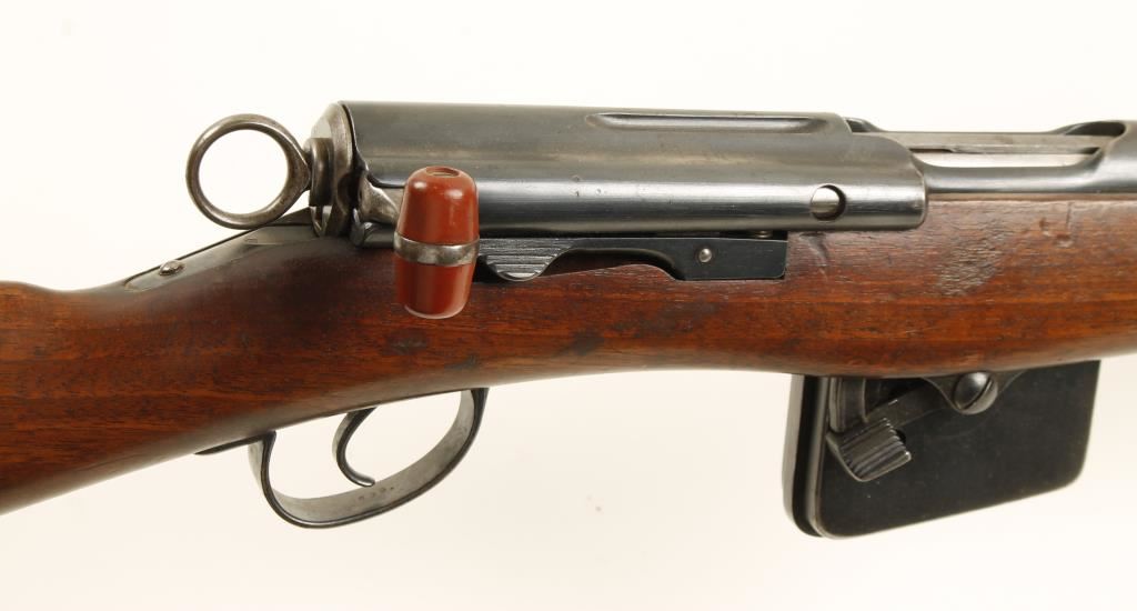Swiss military bolt-action rifle with a 30-3/4" barrel and one magazine. Bluing is worn in exposed areas and edges. Butt plate is a rust brown patina. Wood has dings and scratches and a small crack at the lower tang. Bore is bright and shiny. Action is working well. Condition is very good.