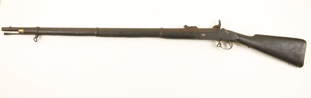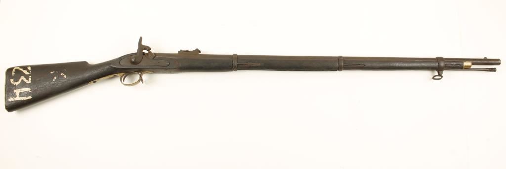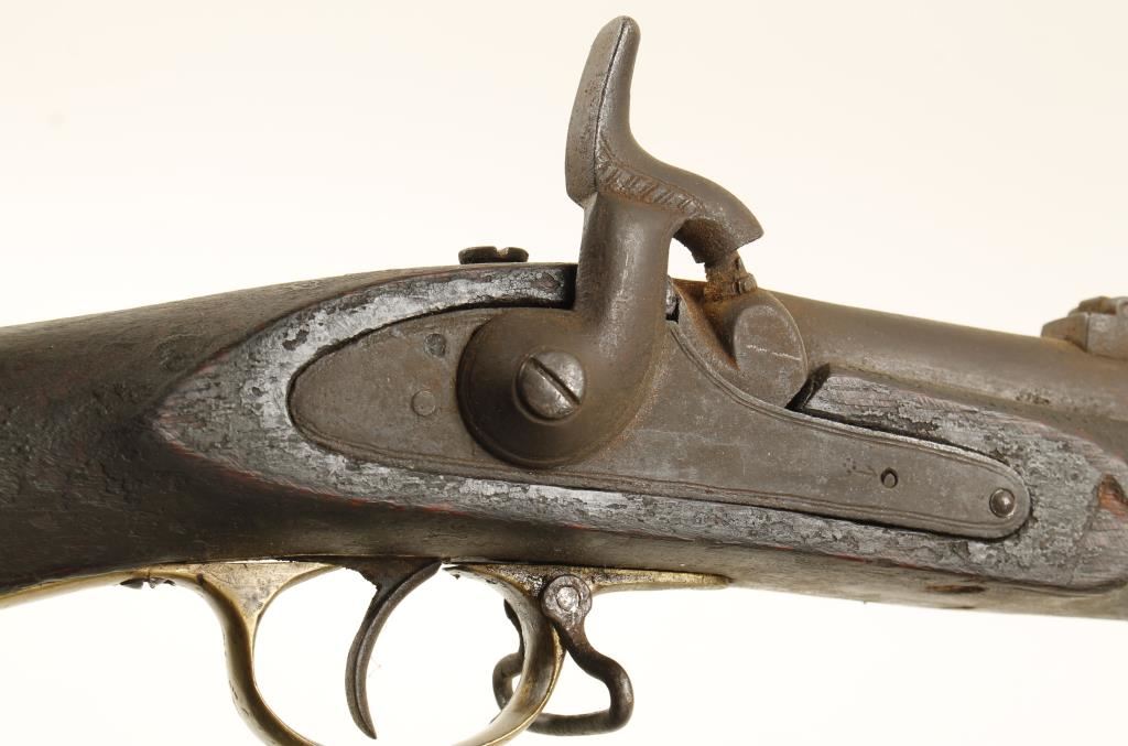 Blued and brass percussion muzzle-loading rifle with a 38" barrel. Steel is all gone to a brown/black patina. Brass trigger guard is worn and stained. Brass butt plate is a new production replacement from Windlass in India. Bore is dirty and rusty and may be a smoothbore. Action doesn't hold hammer cocked. Condition is poor *Antique Firearm*