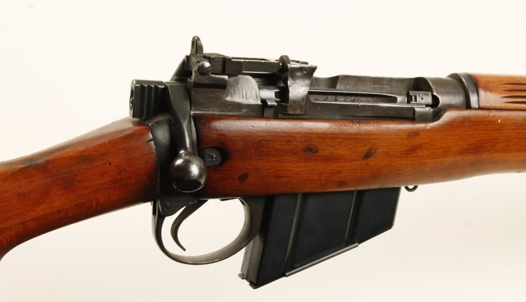 British military blued and painted bolt-action rifle with a 25-1/4" barrel and one magazine. Bluing has faded to grey/brown areas worn to grey bare metal. Brass butt plate with trapdoor has dents and dings. Wood butt is loose and has the letters "FR" stamped on it (Factory Rebuild?). Has dings and rubs. Bore is shiny with some rifling. Action works well. Condition is fair to good. *Modern Firearm*