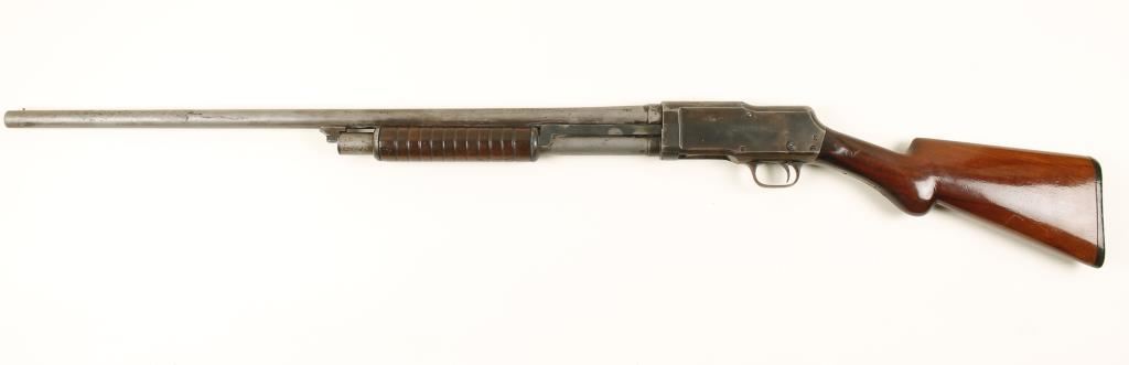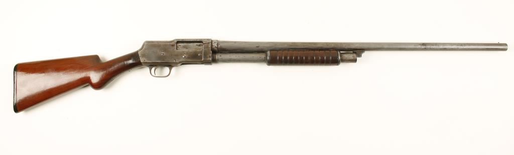 Blued pump-action takedown shotgun with a thirty inch barrel. Finish is mostly gone leaving exposed metal with surface rust. Wood stock has been refinished and has a few scratches and dings. Butt plate is a worn Stevens black plastic item. Pump handle has a couple cracks and dings. Bore has some surface pitting. Action will cock and fire but the bolt lock release has to be worked to cycle the action. Condition is poor. *Modern Firearm*