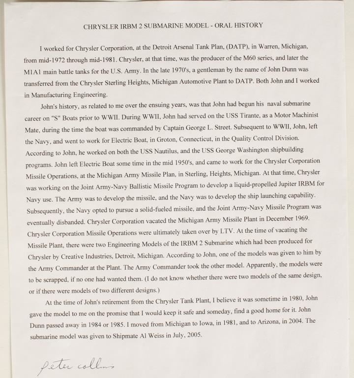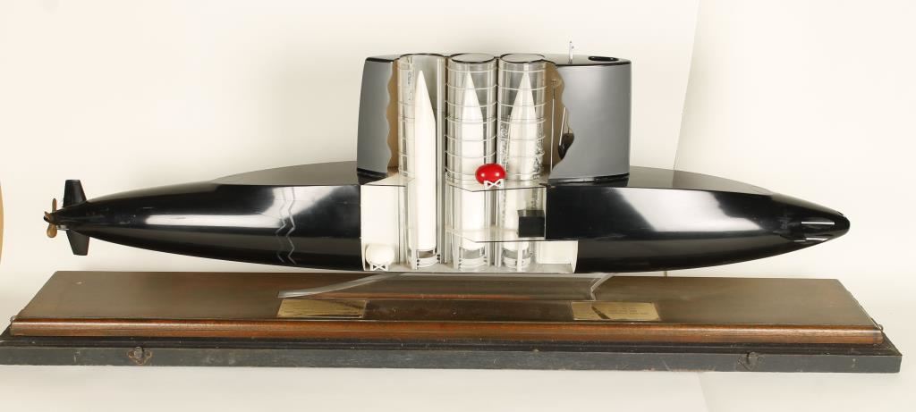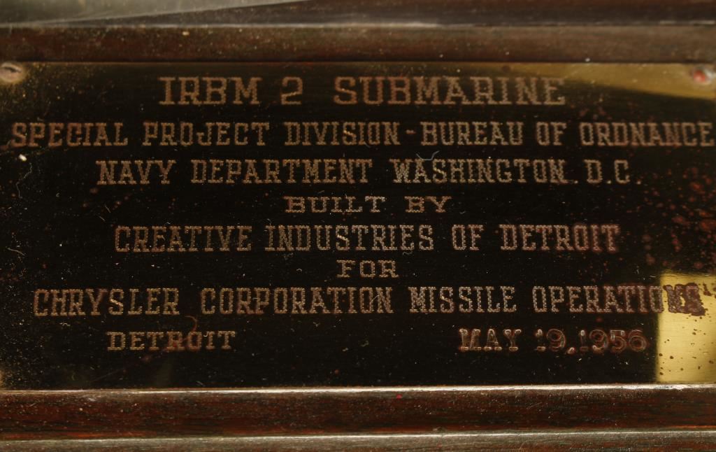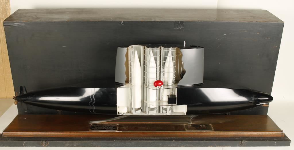 Special Project Division Bureau of Ordinance Navy Department Washington D.C. built by The Creative Industries of Detroit for Chrysler Corporation Missile Operations, Detroit May 19, 1956. Measures 51.5" x 15" mounted wood board. Included wooden carrying case. This is a one of a kind presentation model made for the Chrysler Corporation Missile Operation as a sample of what they could produce. Although they never made this submarine, the Russians made a similar submarine in the 60's.