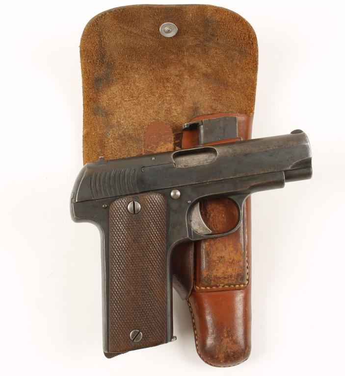 Blued single-action semi-automatic hammerless pistol with a 3-1/2" barrel, a leather flap holster and two magazines. Finish is dull with freckling and edge wear. Bore is good with strong rifling. Function is good. Checkered wood grips are worn to a dark color but they are complete with a few dings. Leather holster is supple and has complete stitching. Condition is good. *Modern Firearm*