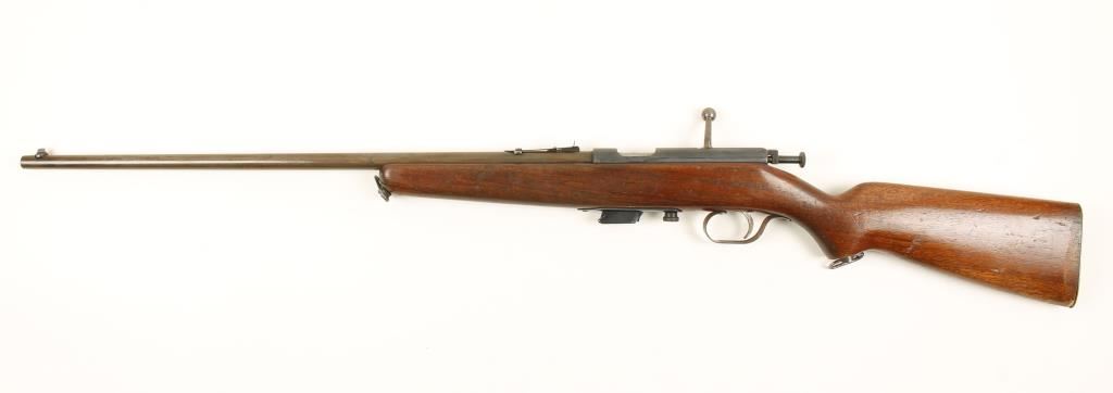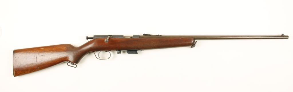 A Sears blued bolt-action rifle with a 24" barrel and one magazine. Barrel and trigger guard have turned to grey/green/brown with some pitting. Receiver and mag housing have good bluing with some edge wear, surface rust and scratches. Butt plate is ill-fitting and has black pitting on bare metal. Wood has scratches, dents and dings. Bore is bright and shiny with good rifling. Action works well. Condition is fair to good. *Modern Firearm*