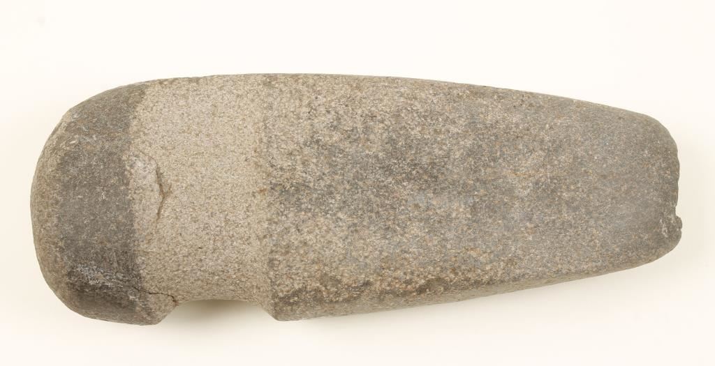 Measures 9" long by 3 1/2" wide with a grooved hand hold. Unknown age and origin.