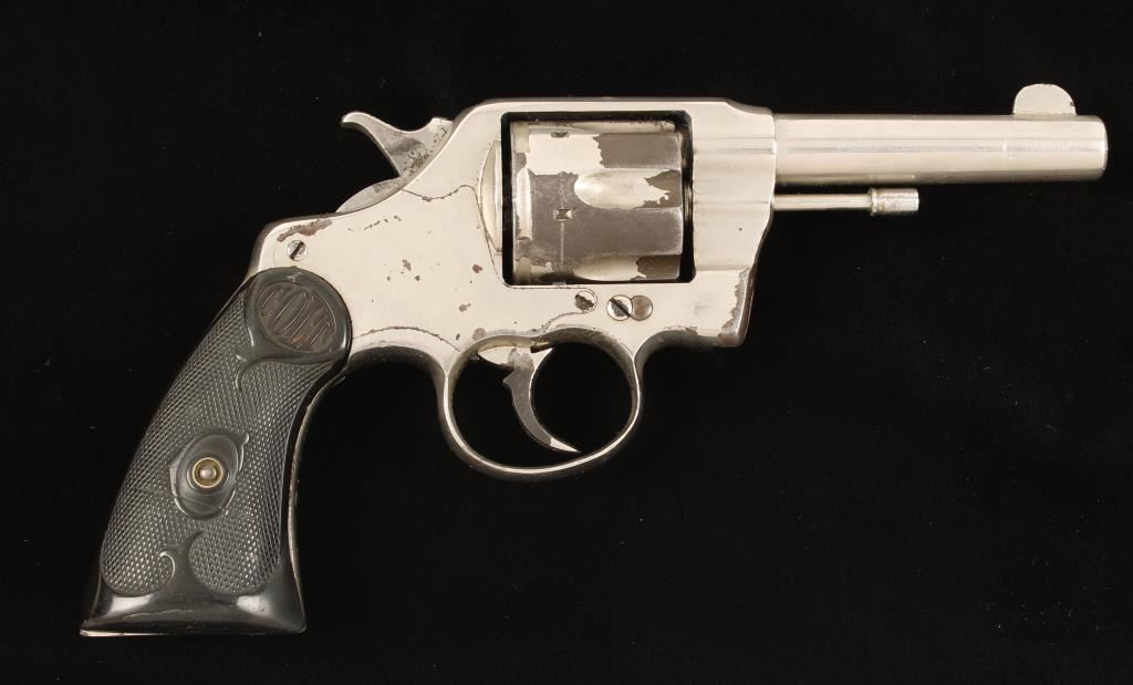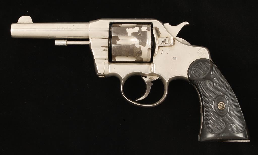 Nickel plated double-action 6-shot revolver with a 4" barrel. The finish is dull with extensive flaking and wear. The bore has shine with strong rifling and many dark spots. The chambers are clear of any deficiencies. The checkered hard rubber grips are in very good, complete condition. Function is good with a somewhat loose lock-up. Condition is fair. *Modern Firearm*