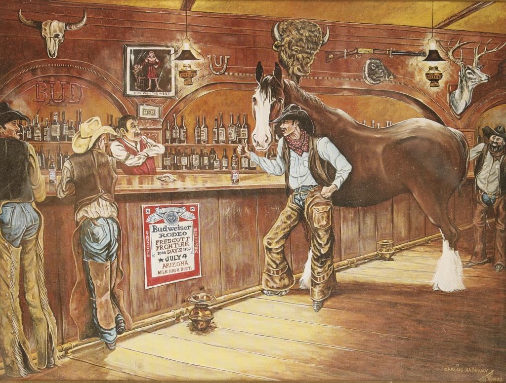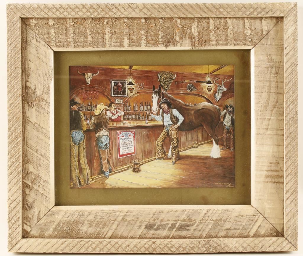 Dated 1982, done as a Budweiser advertiser for the 'Prescott Frontier Days Rodeo' with Clydesdale and cowboys. 12"x8 1/2" nicely framed.