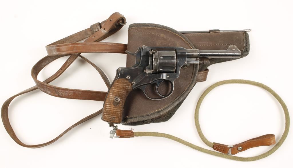 Blued double-action 7-shot gas-seal revolver with a 4-1/2" barrel and an oilcloth flap holster with strap, cleaning rod and lanyard. Stamped "1911". Finish is worn with some freckling of corrosion. Hammer, trigger, loading gate and flat springs are all nitre blued with bright colors. Bore is dirty with sharp visible rifling. The gun doesn't function in double action mode. Grips are worn checkered wood with one sizeable abrasion. Holster is in fair condition with some repaired stitching. Lanyard is kernmantle with a leather belt keeper. Condition is fair. *Modern Firearm*