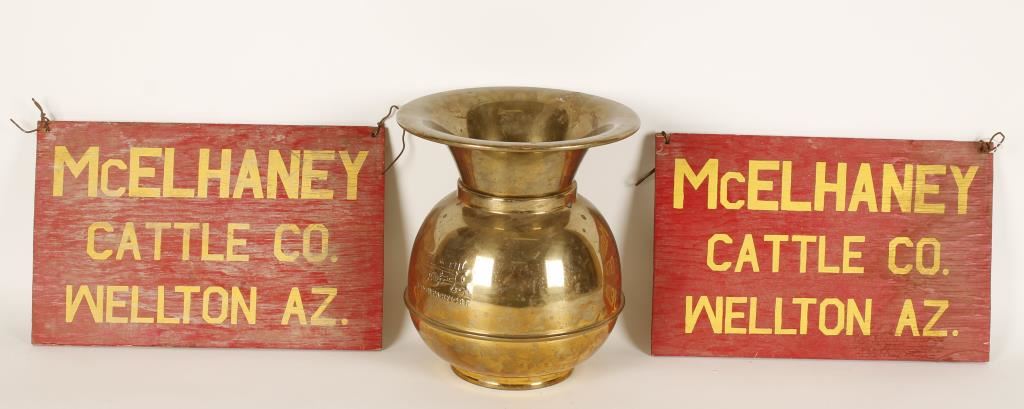 Brass Spittoon embossed on both sides with an image of an old steam locomotive and reads, "Union Pacific R.R.", free of dents and dings, measures 10.25"x 9". Pair of McElhaney Cattle Co., Wellton Arizona, handmade cattle ranch wooden placards. Each has a red background and yellow lettering both in very good condition.