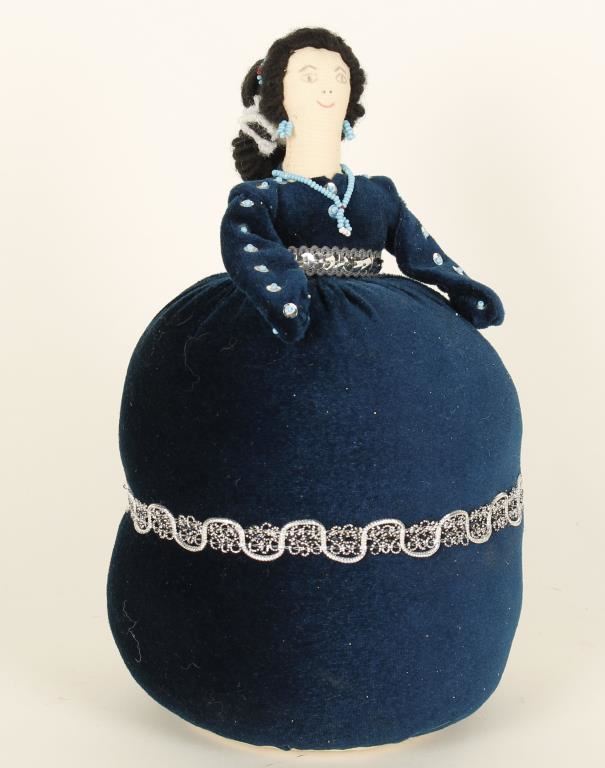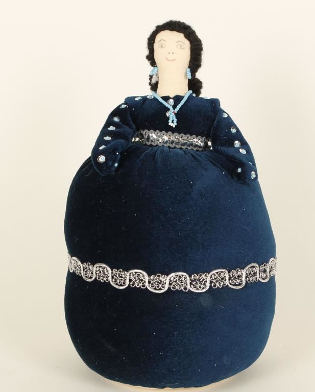 Blue velvet bodice and skirt. The doll's face is hand painted and she wears a beaded necklace, earrings and hair barrettes. Measures 10" tall and 6" diameter.