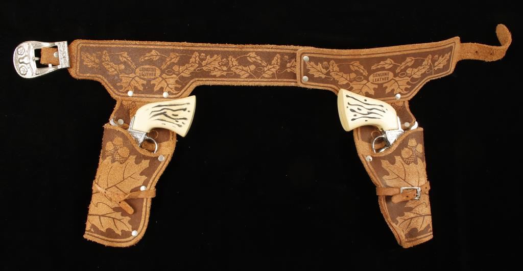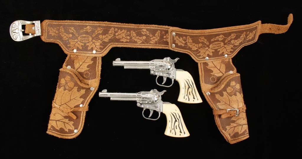 Cap gun set including 2 cap guns and holster belt. Cap guns have minor loss of plating, actions work well, but are not marked. Holster belt is good condition-missing one buckle on one holster decoration.