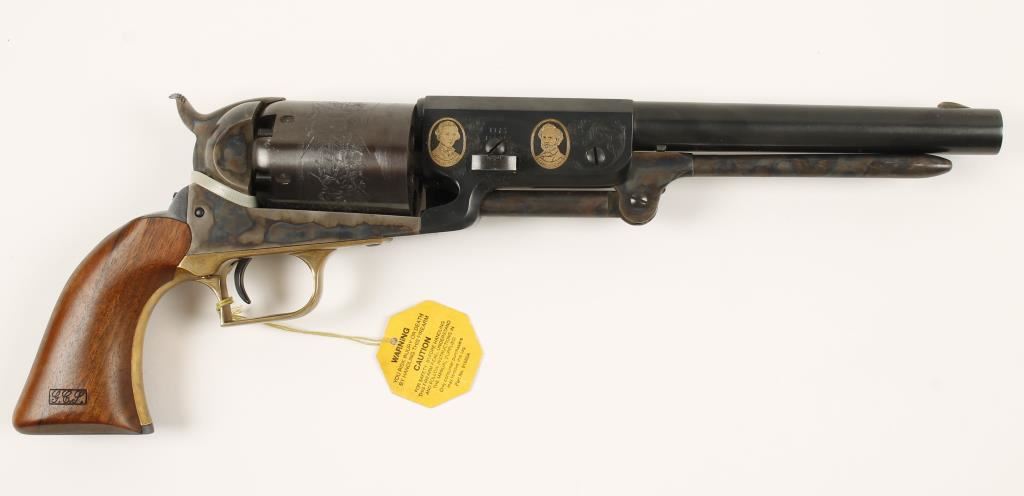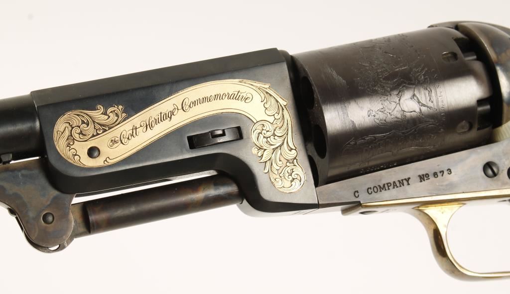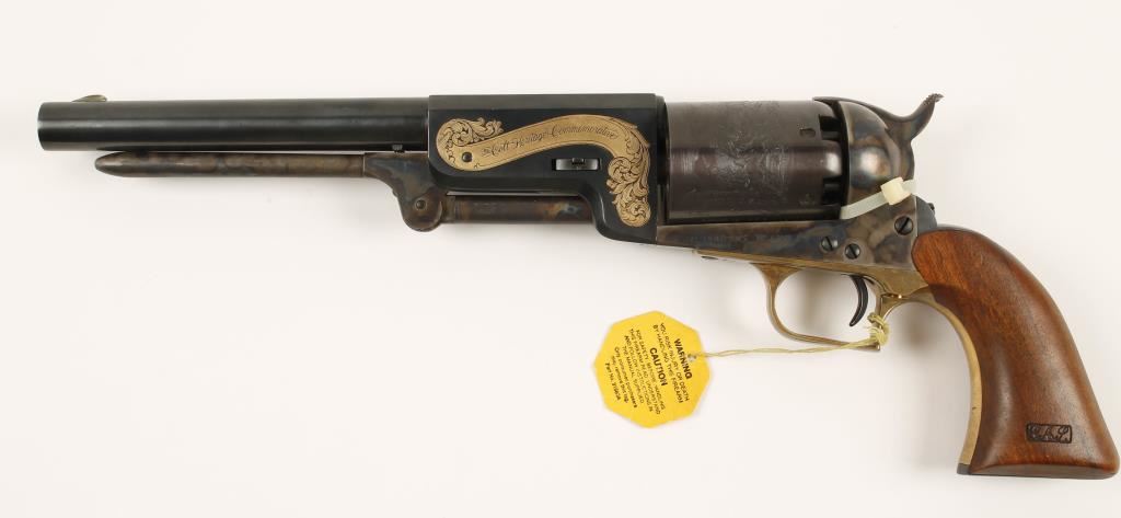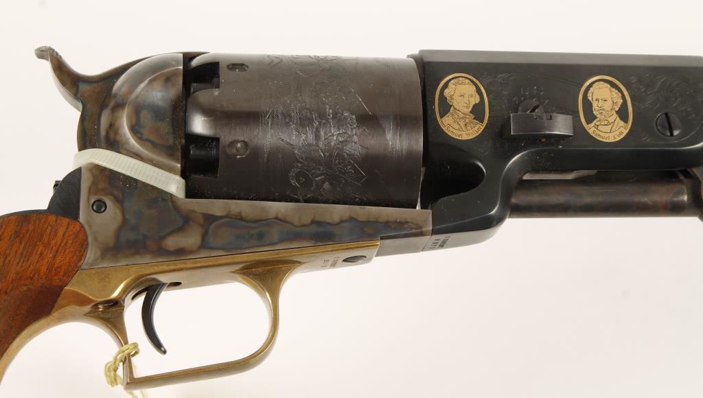 Colt reproduction 6-shot percussion revolver. Blued 9" barrel with engraving and gold highlights. Blued and roll stamped cylinder showing an indian skirmish. Blued backstrap and trigger. Case colored loading lever, frame and hammer. Brass trigger guard. Wood grips are in good condition with cartouches on them. This is a Colt Heritage Commemorative for Samuel Walker and this is part of a series of Walker Colts serial numbered for "C" Company of the Texas Rangers. Condition is excellent. *Antique Firearm*