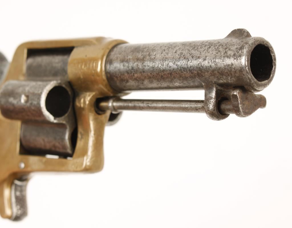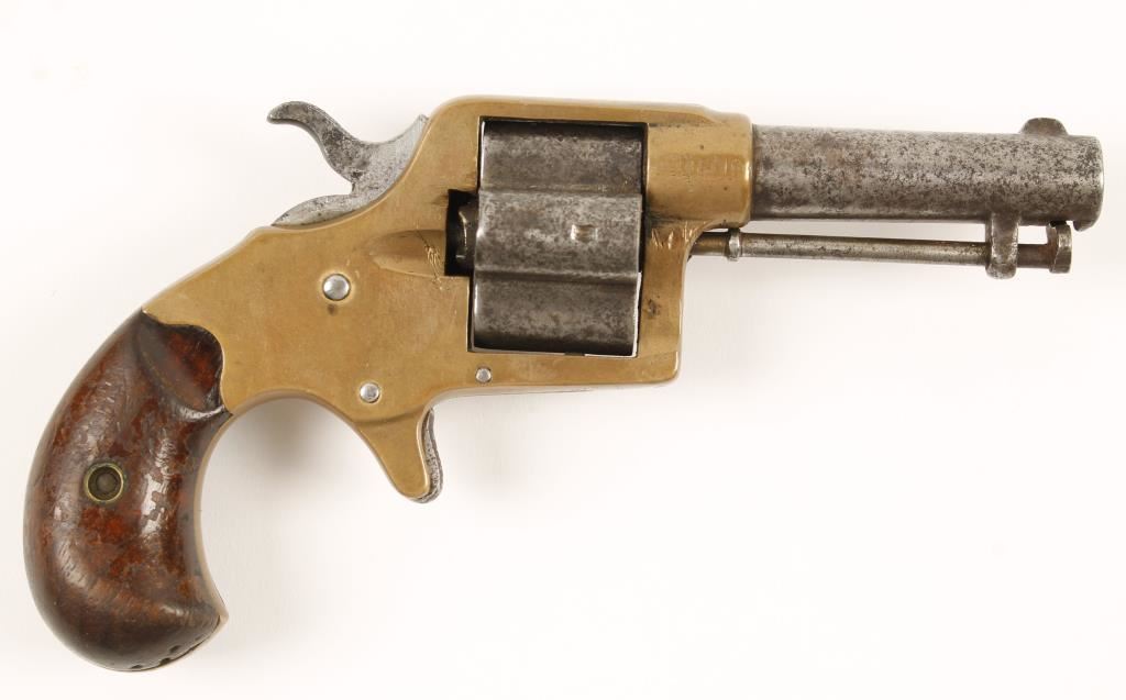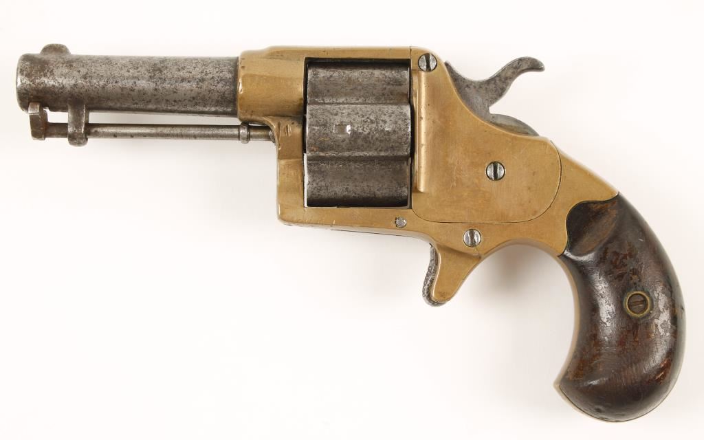 Made in 1874 this is a four shot rimfire revolver. The barrel, ejector rod, cylinder, hammer and trigger are steel and the frame is brass. The steel was blued but now is a mottled silver and grey. There is some pitting and evidence of surface rust. All the roll stamped information is clearly legible. The brass is not bright and has a few dings but is in overall good condition. The action is tight and in good working order. Condition is very good. *Antique Firearm*