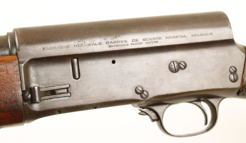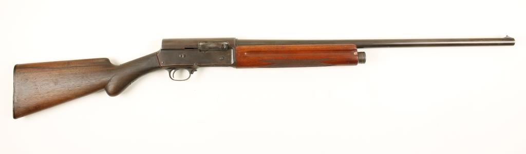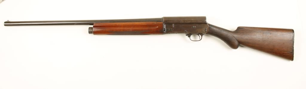 Blued semi-automatic long-recoil shotgun with a 25-1/2" barrel. Finish has turned to a brown patina with light scratches and rubs. Bore is almost mirror bright. Action is good. Forend has dings and scratches and worn checkering with one small chip missing. The round-knob butt stock has lost almost all of its checkering and has many dings and scratches. There are leather spacers between the receiver and the stock . The original butt plate has been damaged and repaired. Condition is fair plus. *Modern Firearm*