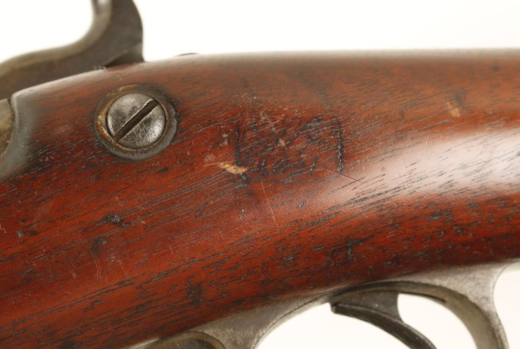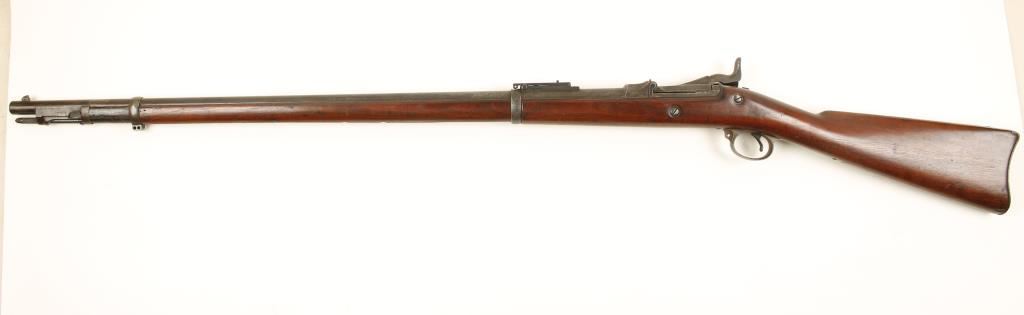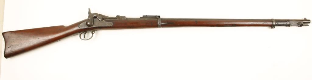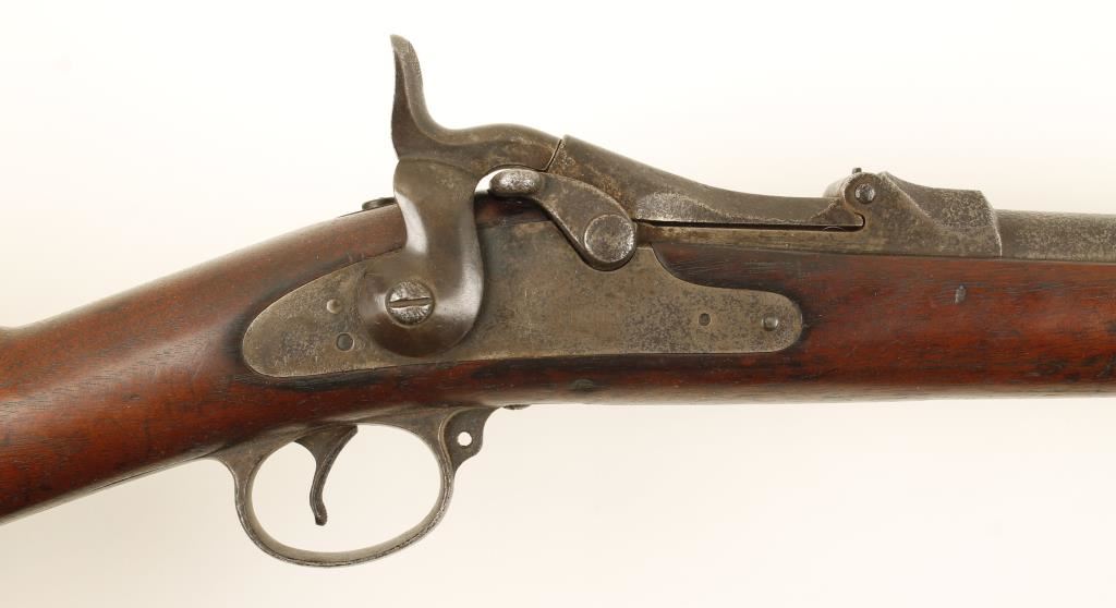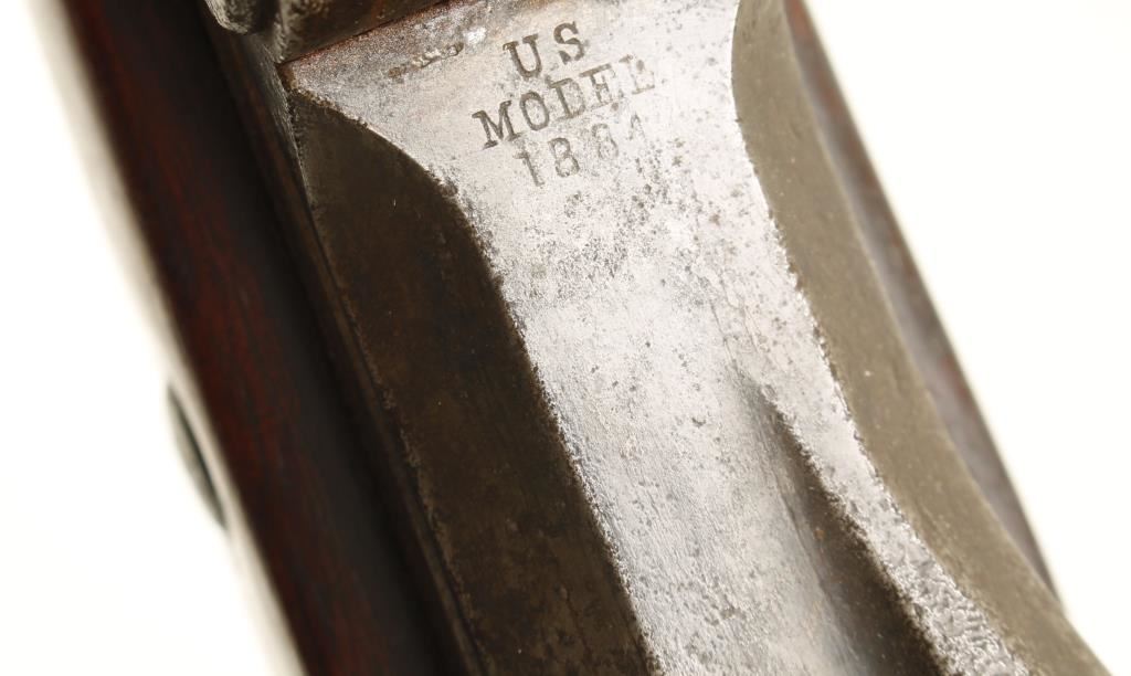 U.S. military single-shot rifle with a 32-3/4" barrel. Includes integral rod bayonet. Bluing has faded to grey/brown with lots of heavy pitting at muzzle, rear barrel band, first third of the barrel, receiver, trigger guard, buttplate and the lock plate. Stock has a cartouche on the side and a circle behind the trigger guard. Stock has missing chip, dings and scratches. Bore is dark with strong rifling. Action works well. Condition is fair. *Antique Firearm*
