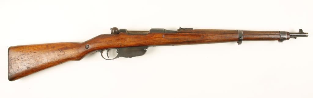 Hungarian blued military straight-pull bolt-action rifle with a 19-3/4" barrel. Import marked. Bluing is worn on exposed areas and edges leaving some pin-prick pitting and surface rust. Rear barrel band is missing its retaining screw. Wood has dings and dents and a filled area from a sling swivel on the belly of the butt stock. it also has the numbers "4510" and 7936" with the initial "M" scratched in. Bore is frosty with good rifling. Action works well. Condition is poor to fair. *Modern Firearm*