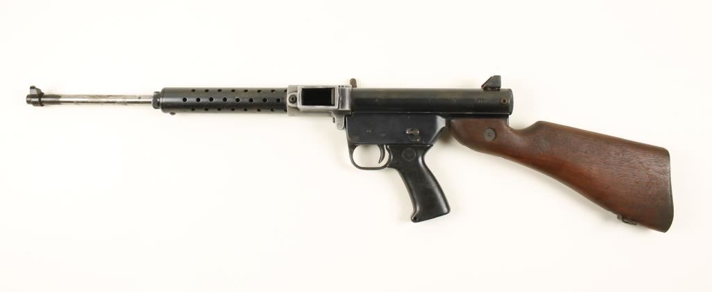 Semi-automatic carbine with a 16" plugged and bulged barrel with 4 rings inside. No magazine. Most of the bluing on barrel has been removed. Shroud and receiver tube have small spots of surface rust. Alloy trigger group is dirty but in good condition. Thompson M1A1 stock has been modified to fit the trigger group and it has one crack and numerous dings and scrapes. Action works. Bore is terrible. Condition is poor.