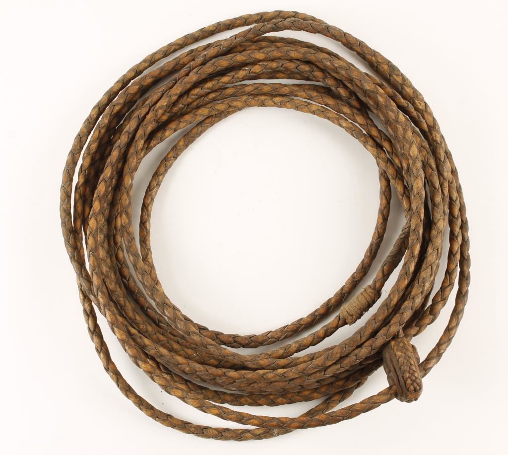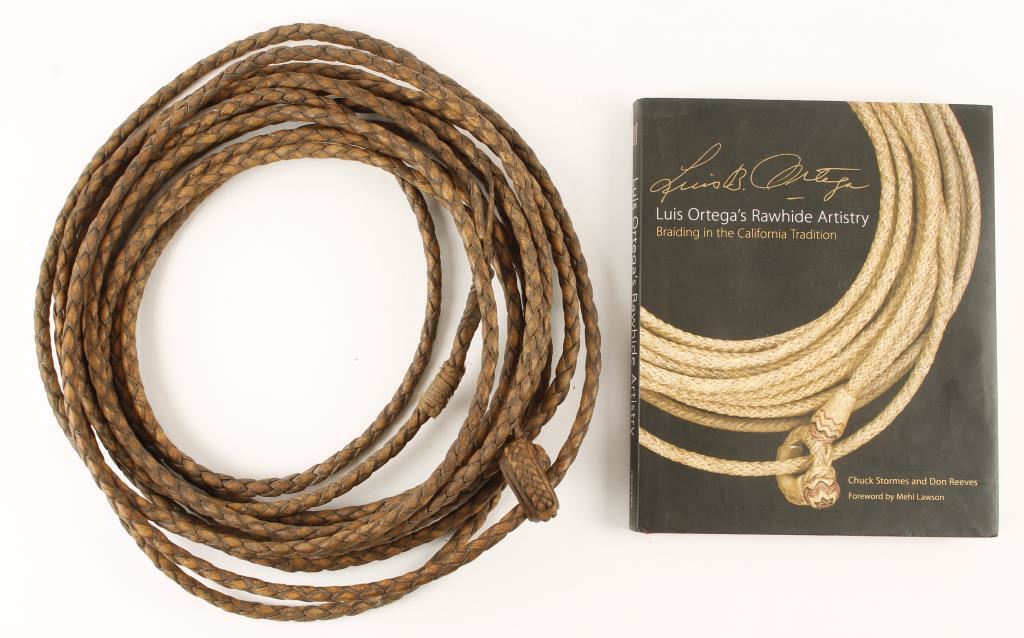 Constructed of braided rawhide. Made by the famous leather artist Luis Ortega. Purchased by Tony Rios directly from Ortega in the 1960s while Tony was performing in the Cow Palace, San Francisco Rodeo. Extra long made with extra fine details. A very special piece made on custom order between friends. Also included the "Luis Ortega Rawhide Artistry" book.