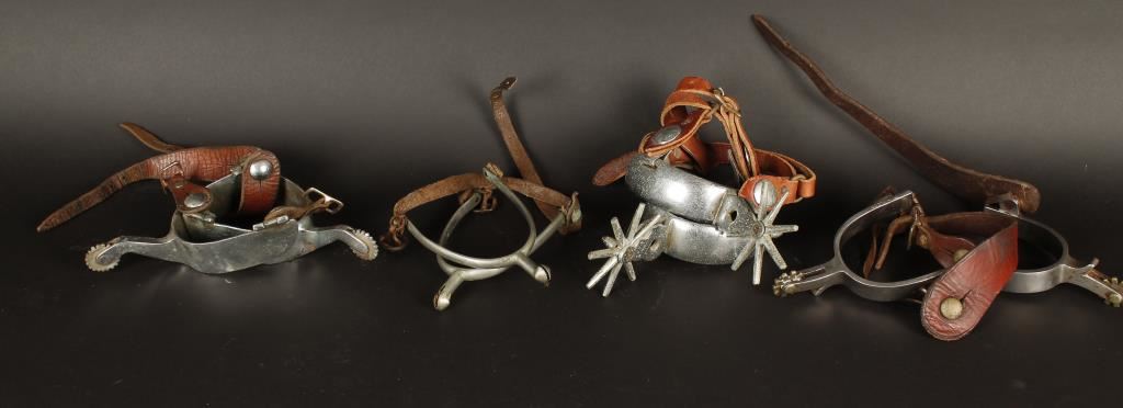 (1) Mexican Style Spurs passed down from Grandfather to Rios. (1) Pair of Crockett Spurs marked (1) Pair of 19th Century Military Spurs worn by Rios grandfather who was a smooth bore cannon specialist that settled in Santa Barbara California.(1) Pair of Goose neck Spurs Nickeled. All from the estate of Tony Rios.