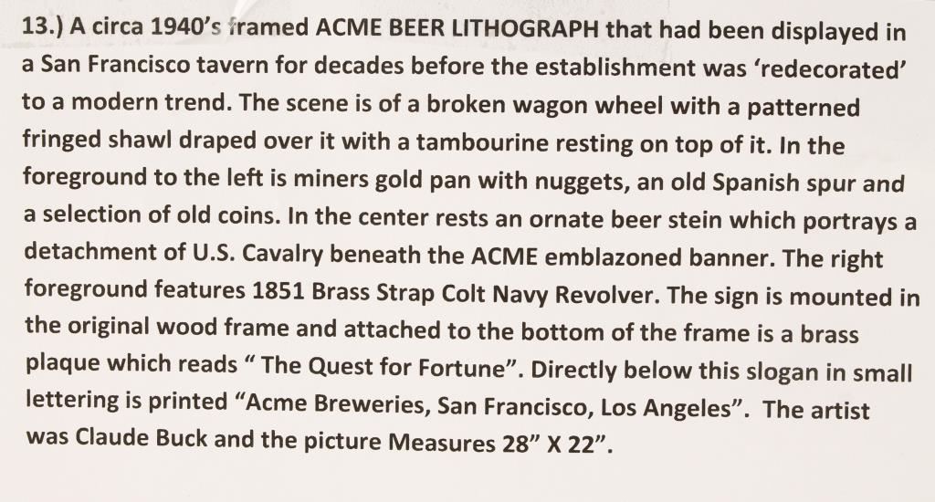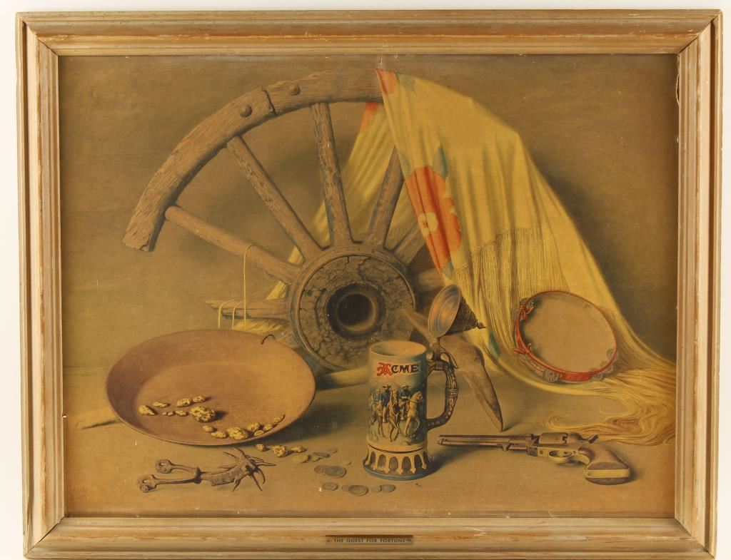 Was displayed in a San Francisco tavern for decades before the establishment was 'redecorated' to a modern trend. The scene is of a broken wagon wheel with a patterned fringed shawl draped over it with a tambourine resting on top of it. In the foreground to the left is a miners gold pan with nuggets, an old Spanish spur and a selection of old coins. In the center rests an ornate beer stein which portrays a detachment of the U.S. Cavalry beneath the ACME emblazoned banner. The right foreground features an 1851 Brass Strap Colt Navy Revolver. The sign is mounted in the original wood frame and attached to the bottom of the frame is a brass plaque which reads "The Quest for Fortune". Directly below this slogan in small lettering is printed "Acme Breweries, San Francisco, Los Angeles". The artist was Claude Buck and the picture measures 28" x 22". Original