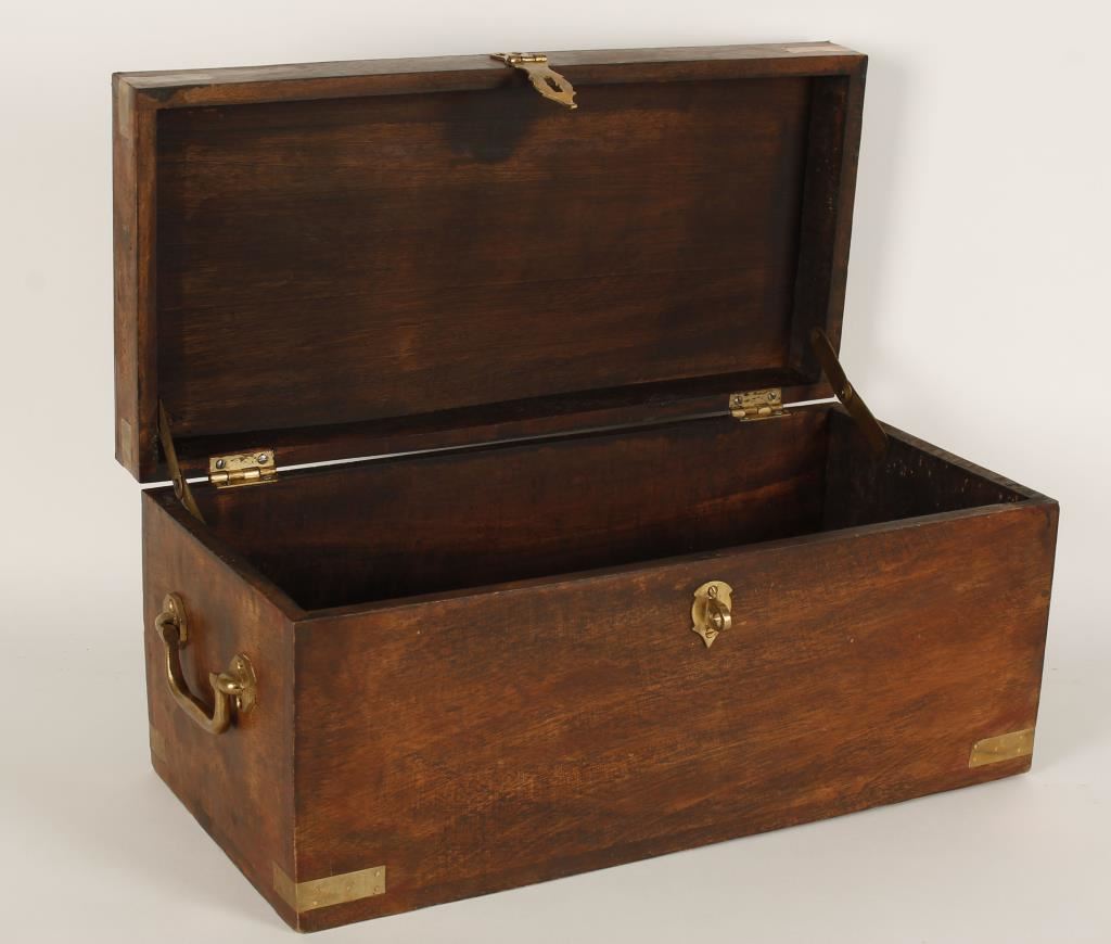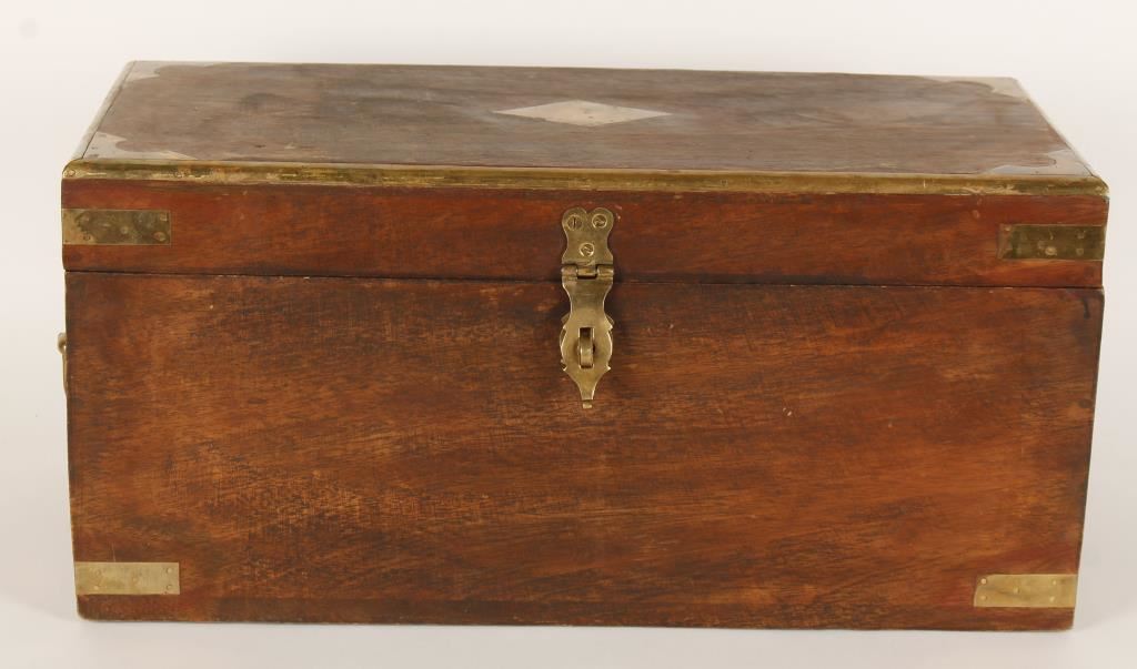 Brass stripping, brass locking latch, brass hinges and brass handles, measures 18"x 8.5"x 8". An exceptional chest in very good condition.