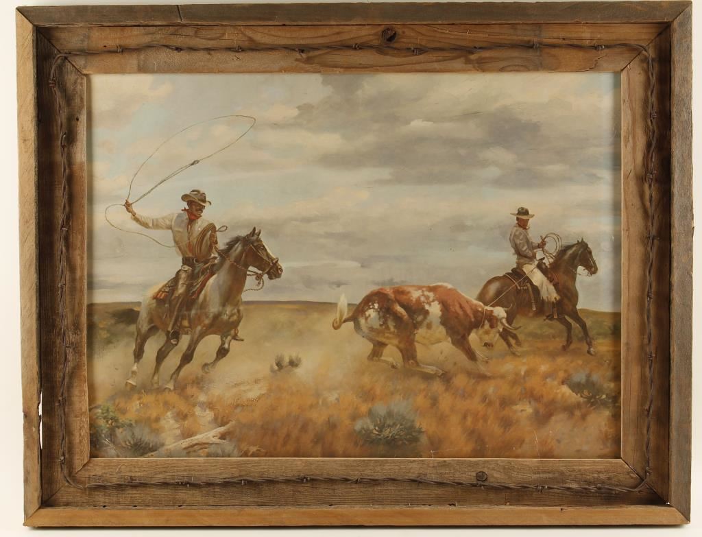 Depicting cowboys roping a steer. Framed in rustic barnwood with barbed wire details. Unknown artist. Image size 27"x20".