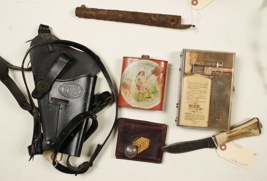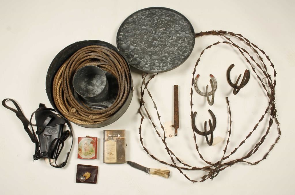 Including; Galvanized box with lasso, vintage barbed wire symbol, 3 horseshoe hangers, a US marked reproduction shoulder holster, Remington skinning knife, Indian Rifle Gunpowder Container-early 1900's, a relic barrel found on the Rios Ranch, buck knife sharpening kit and a western bi-fold wallet. All from the estate of Tony Rios.
