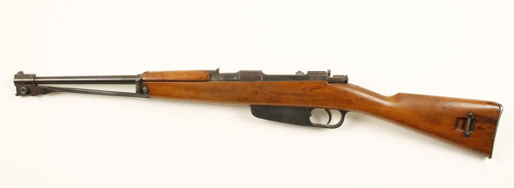 Blued Italian military carbine with a 17.63" barrel and fixed rear sight. Bluing has some surface rust and pitting and has faded to a brown patina on receiver and barrel band. Butt plate has a small trapdoor with patina and bare metal with pitting. Wood has dings and scratches with "U475" and an illegible circular cartouche stamped on the left side of the butt. Bore is a little frosty with strong rifling. Action is working. Includes permanently attached folding bayonet. Condition is fair to good. *Modern Firearm*