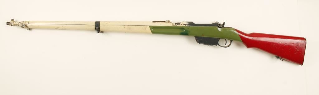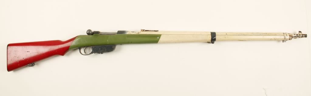 Austrian made Bulgarian military blued bolt-action straight-pull rifle with a 30.3" barrel. Painted in the colors of the Bulgarian flag. Visible blued metal is turning to brown with edge wear. Stock is covered in paint with some dings in it. Bore is shiny with rifling. Action is working well. Condition is good, colorful but good. *Modern Firearm*