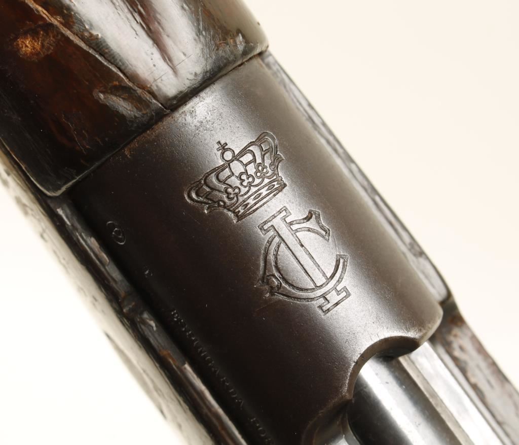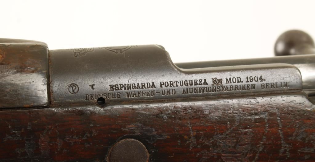 Made by DWM for Portugal from a Portuguese design. Blued military bolt-action rifle with a 23.6" barrel. Stamped with the crown and the crest of Carlos I of Portugal. Import marked. All visible serial numbers match. Includes a muzzle protector. Metal finish is worn to a patina with freckles of rust stains and some pitting. Wood is dark with dings and dents and an ill-fitting handguard. Bore is frosty with rifling. Action works well. Condition is fair. *Modern Firearm*
