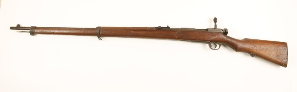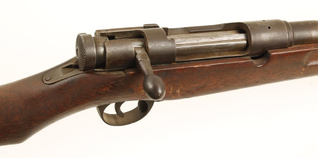 Japanese military blued bolt-action rifle with a 31-3/4" barrel, bayonet and scabbard. This rifle is marked with 3 kanji, the first is for "well" and the last is for "type" but the middle one is unknown to me. I believe this is a training rifle as the bolt has no common bolt stop ejector and the bolt has been modified to eject training rounds. The bore is almost shot out, a smoothbore which falls in with the standards of training rifles. the extractor is also different. It is not like the Mauser extractors found on other Type 38s. There are no locking lugs in the bolt head, only on the bolt body ala Mosin Nagant. THIS RIFLE SHOULD NOT BE FIRED! Metal finish has been worn to a brown patina with light pitting. Wood stock has its usual assortment of scrapes and scratches, dings and dents. Action works. Bayonet has the number 161 stamped on the left scale and the blade is 15-1/2" long. Condition as a training rifle is good, as a firearm it is beyond poor. *Modern Firearm*