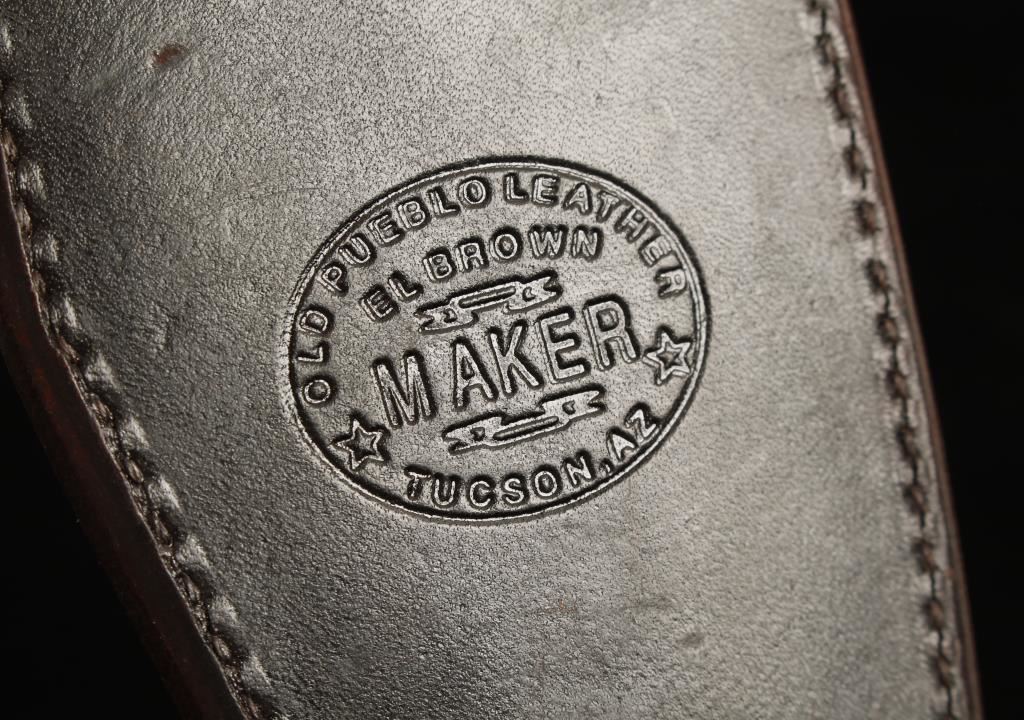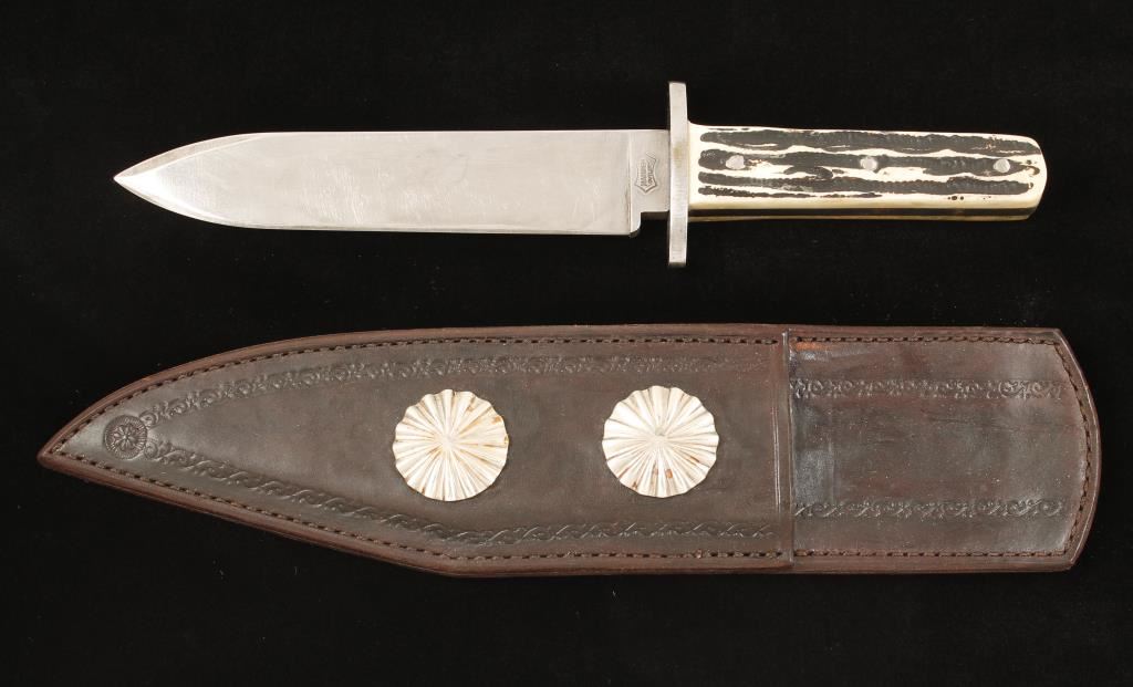 Bone handled with brown leather, western by Old Pueblo Leather Company Tuscon AZ. Scabbard maker marked with two nickel conchos. 11" overall with a 6 " blade.