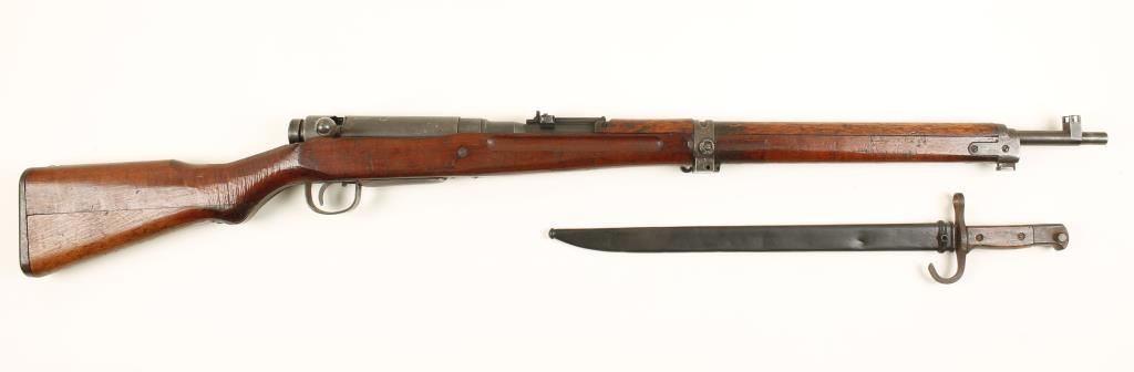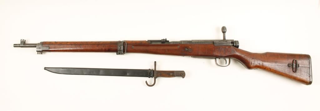 Japanese military blued bolt-action rifle with a 26" barrel, dust cover, bayonet and scabbard. "Mum" is intact. Has a barrel band for a monopod but no leg. metal finish is turning to brown and has edge wear. Wood has a crack at the joint in the butt and there is hand carved alteration in the wrist. There are the usual dings and scratches. Bayonet blade is 15-5/8" long. Bore is frosty with good rifling. Action works well but the dust cover interferes when applying the safety. Condition is fair to good. *Modern Firearm*