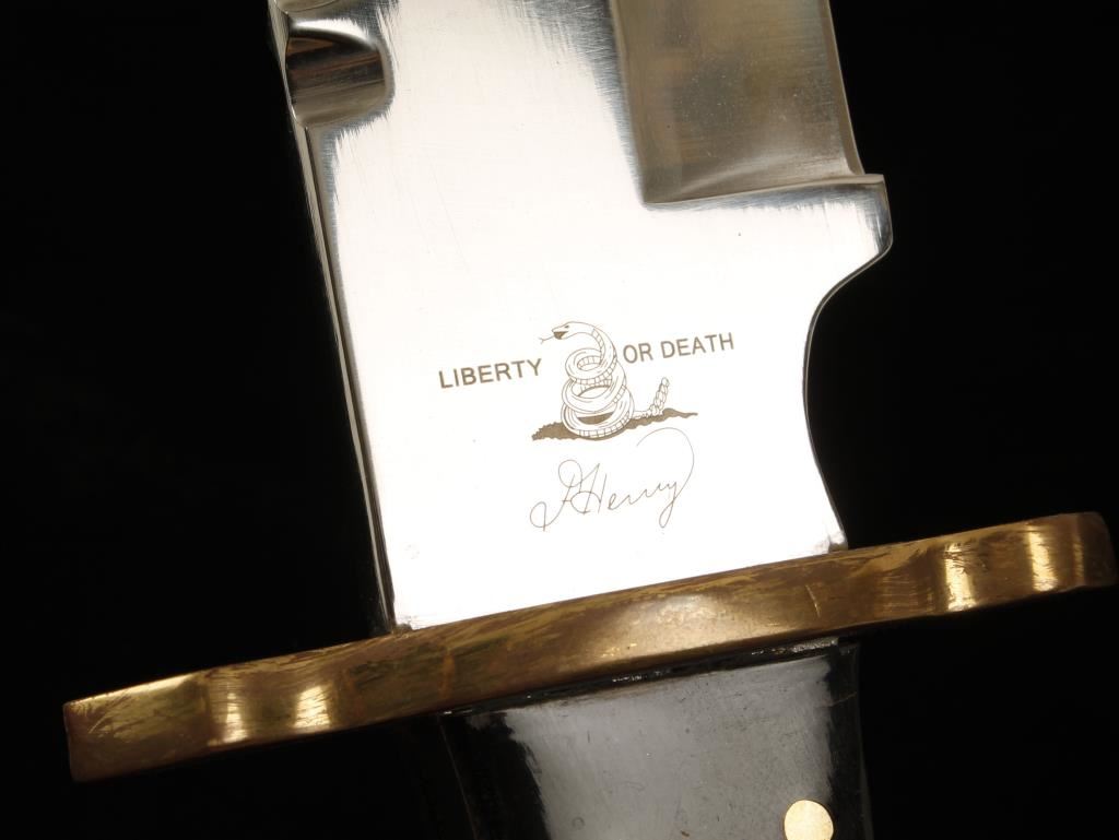 Marked "JP Henry" with motto "Liberty or Death" showing striking snake. The knife measures 14" overall and has a semi coffin shaped hilt with blackened horn grip. Condition is fine to near excellent. A collectable maker.
