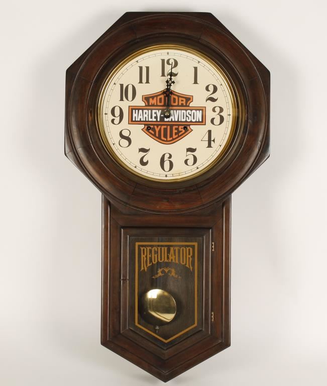 by Regular with custom Harley Davidson face. Oak Case. Measures 31 1/2" h x 18"w.
