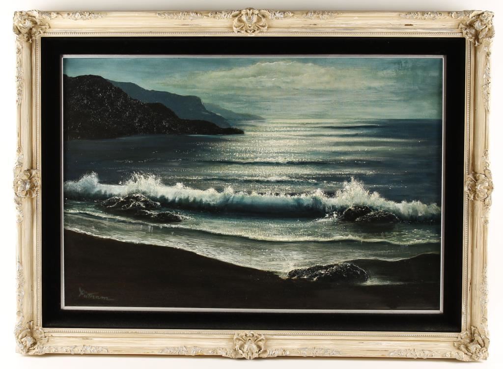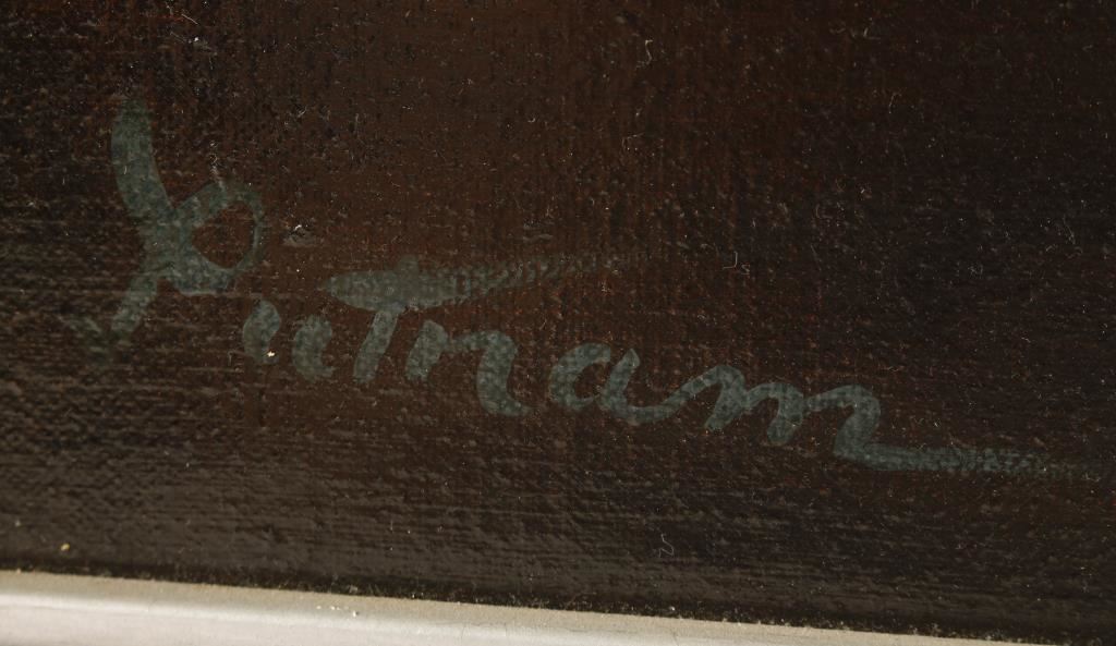 by Putnam. Depicting a beautiful ocean scene. Black velvet matting with a white frame. Image size is 35"X26". It has minor condition issue, appears that the canvas has a press against it mis-shaping the canvas.