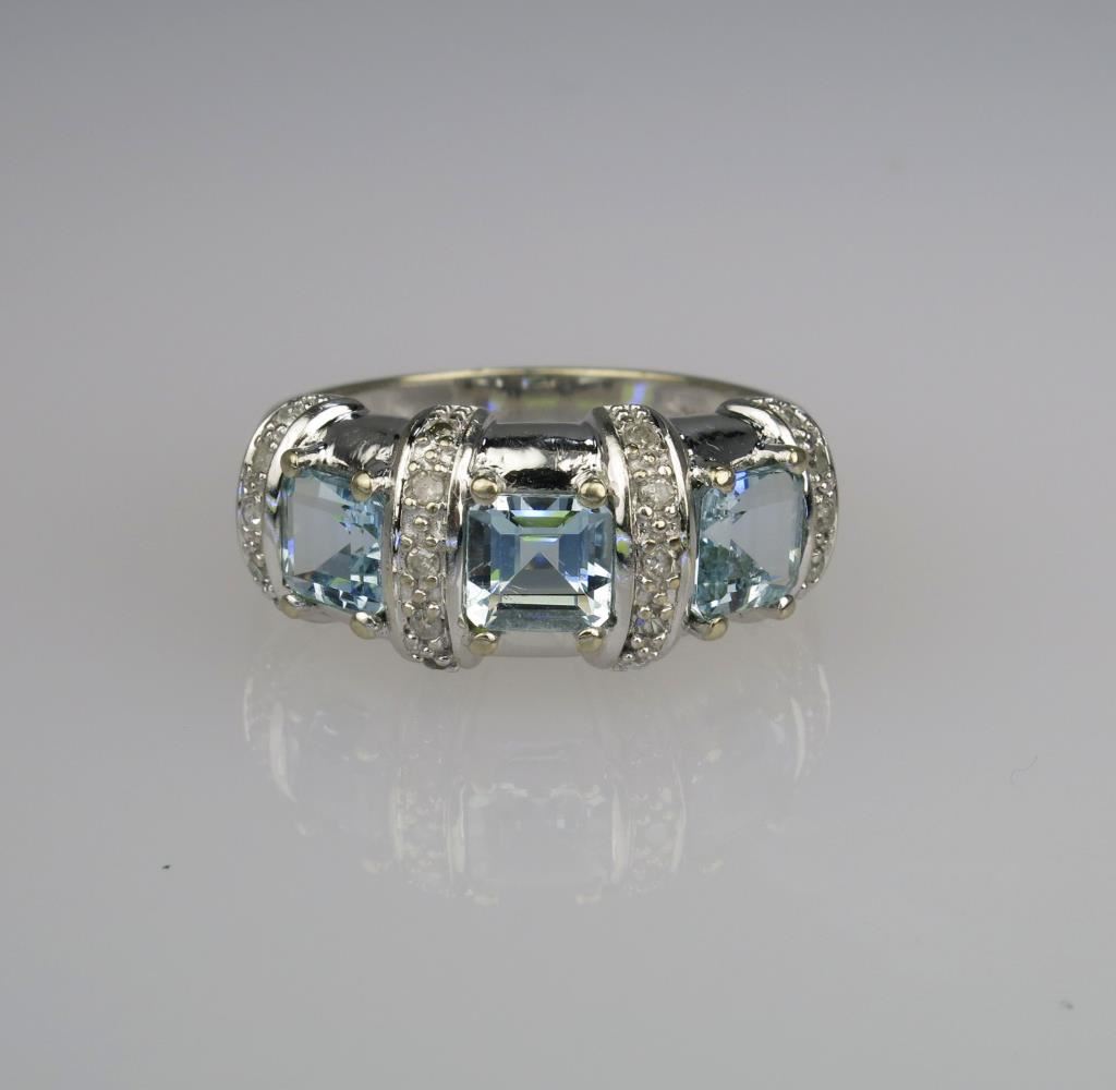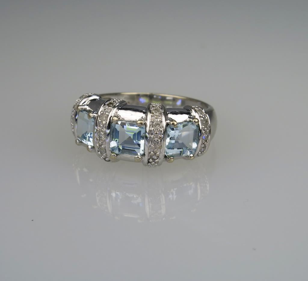 3 Princess cut Aquamarine weighing approx. 2.50 carats total with 20 round cut accent Diamonds set in 14 karat white gold.