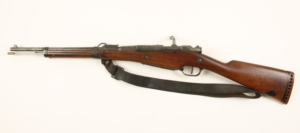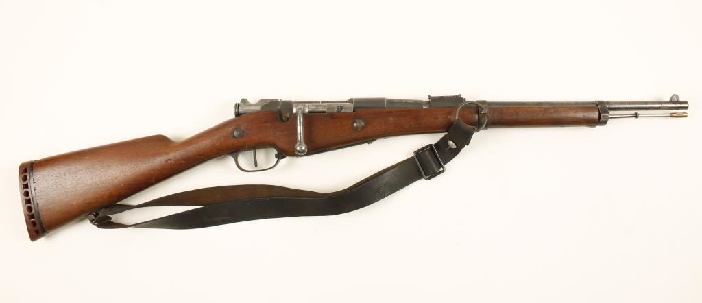 French military blued bolt-action carbine with a 17-3/4" barrel and a leather sling. Barrel is marked "MA C 1893". Metal finish has worn to silver with many rust stains, surface rust, and deep pitting near the muzzle. Only the receiver and bolt serial numbers match. Stock has a recoil pad added on and the wood has scratches, rubs, dings, dents and a small chip. The carbine is missing a barrel band keeper and the rear sight slide. Bore is shiny with sharp rifling. Action works well. Condition is poor.