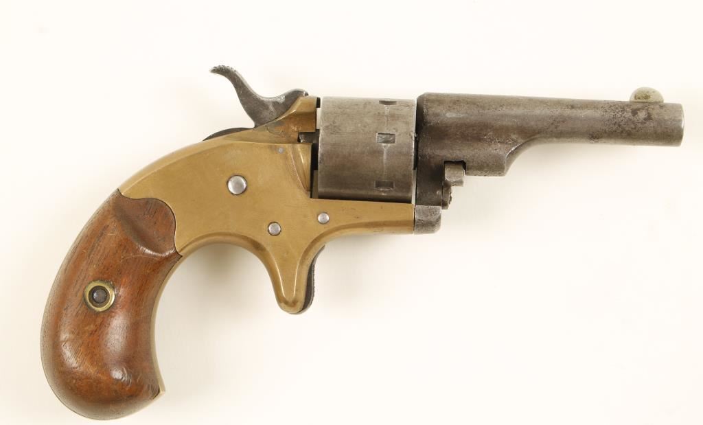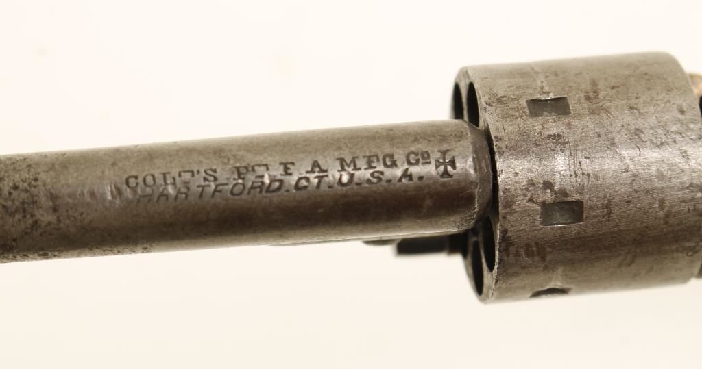 Made in 1875. Blued and brass 7-shot revolver with a 2-3/8" . Steel barrel is worn to grey with rust stains and moderate pitting. There are a few dings on the brass and the steel and a drag line. Grips have dents, dings and scratches. Bore has some pitting with light rifling. Chambers have pitting. Action works well with loose lock-up. Condition is good. *Antique Firearm*