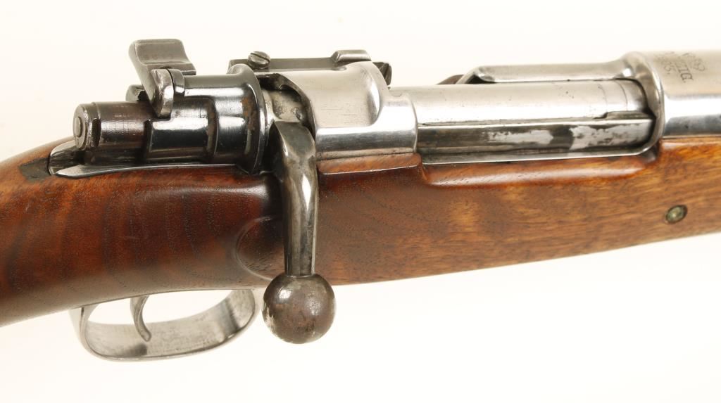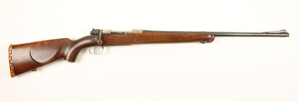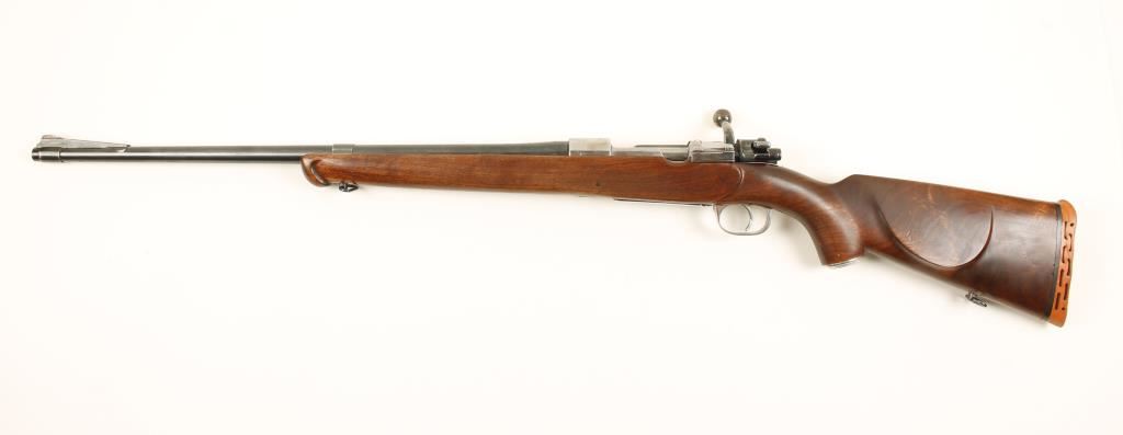 98 Mauser military action made at Danzig Arsenal with a Springfield 1903 23-1/2" barrel dated 2-29. Receiver, floor plate, grip cap and bottom metal have all been plated with over 99% plating remaining. Bolt shroud and bolt stop have surface rust and pitting. Blued barrel has edge wear. Recoil pad is almost ossified. Wood stock has cheek rests on each side, side panels and a forend tip halfway between a schnabel and an Alexander Henry. There is a cross bolt. There are a few scratches and dings. Bore is bright and shiny. Action works well. *Modern Firearm*