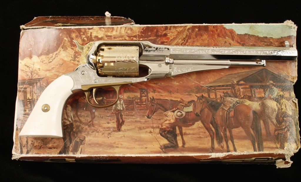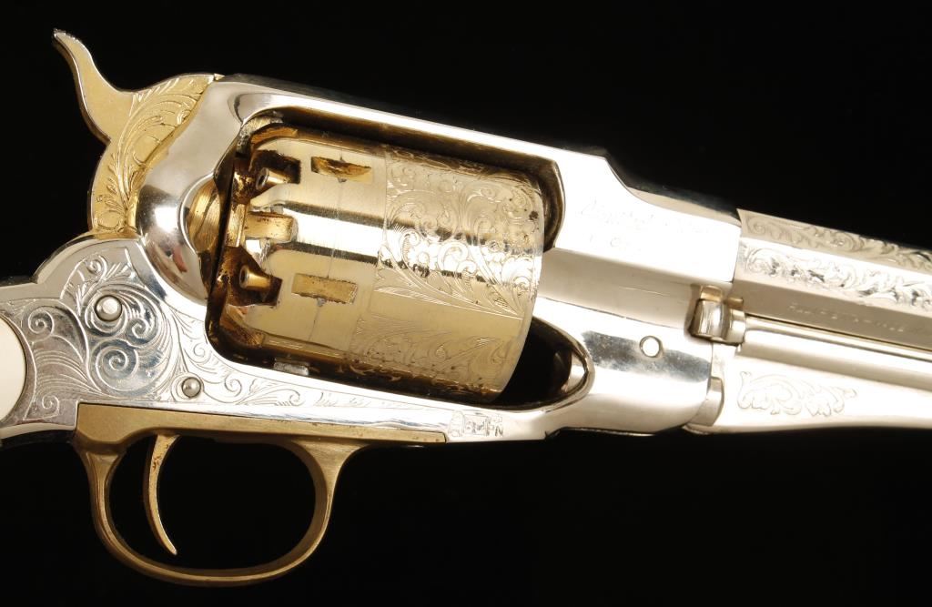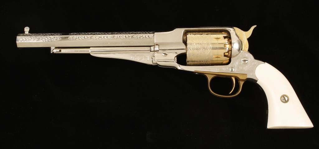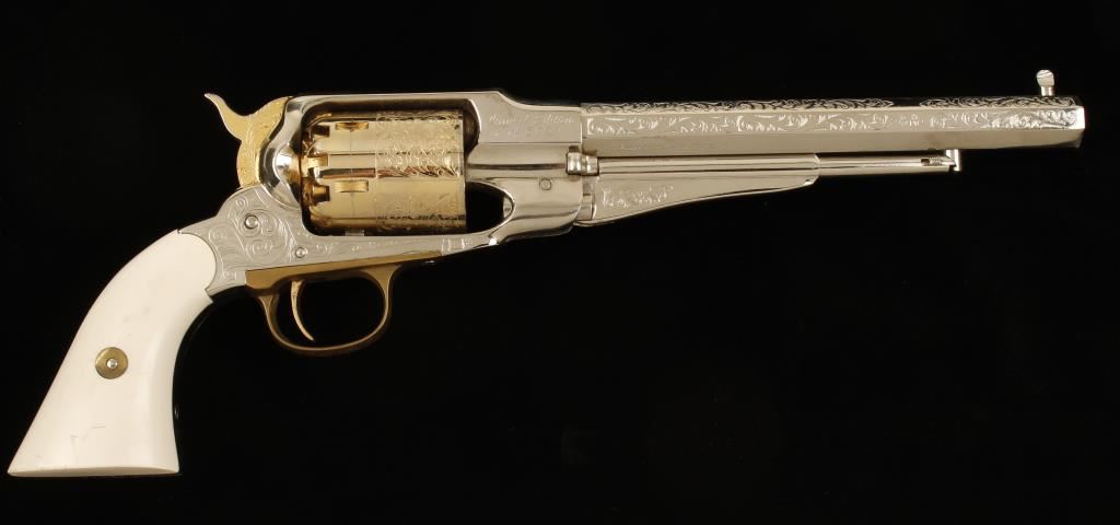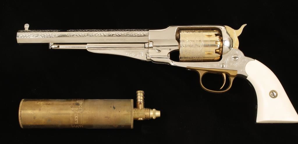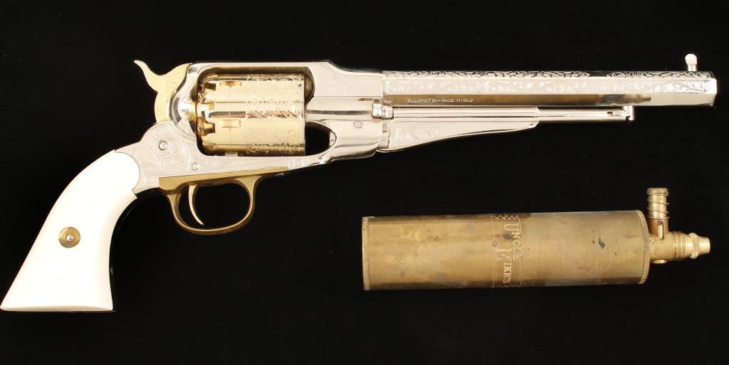 Replica plated and brass black powder 6-shot percussion single-action revolver with a 8" octagon barrel. Ornately engraved and nickel plated barrel, frame and loading lever are in good shape with a few dings and scratches. Gold-colored plating on the cylinder, trigger and hammer have a few perforations to bare metal and there is a drag line. Bore is a black mess with rifling. Action is tight and works well. Condition is good. Includes Styrofoam packing and an Uncle Mike's powder flask. *Antique Firearm*