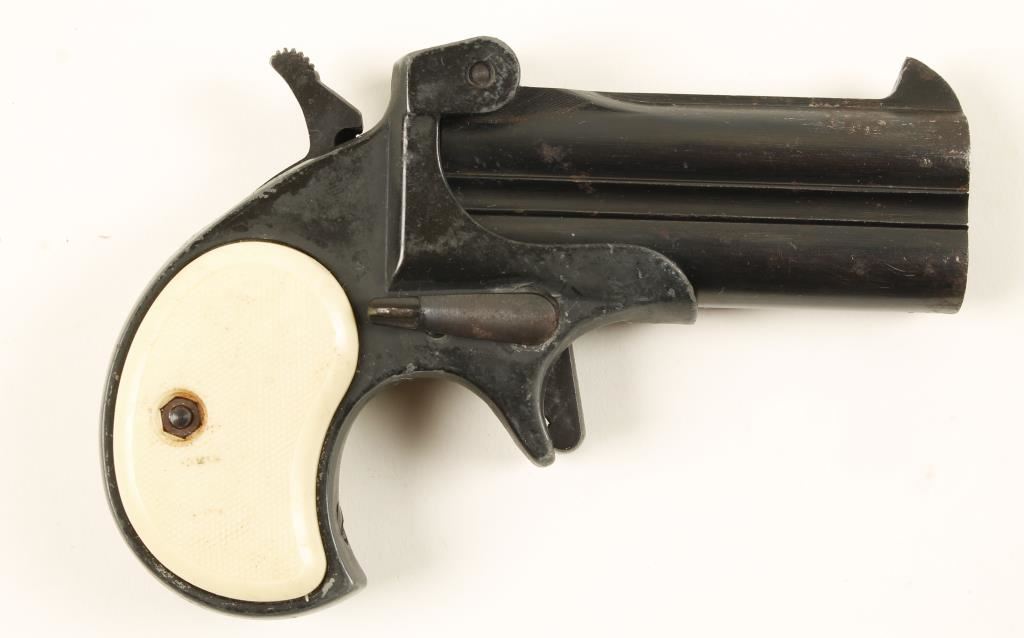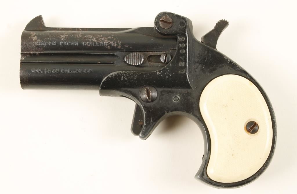 Blued steel and black alloy over-under derringer with 3" barrels. Blued barrels have surface rust and pitting. Alloy frame is dull black and wearing to grey. Checkered plastic grips are scratched. Action works well but barrels are a little loose. Bores are shiny. Condition is fair. *Modern Firearm*